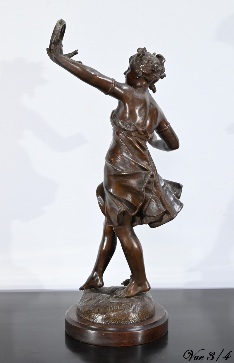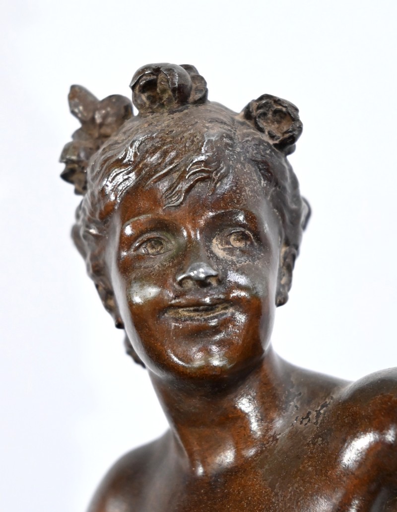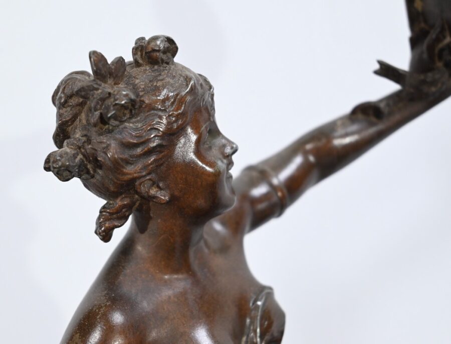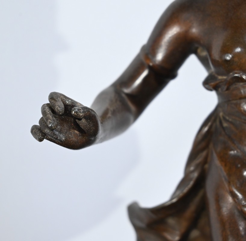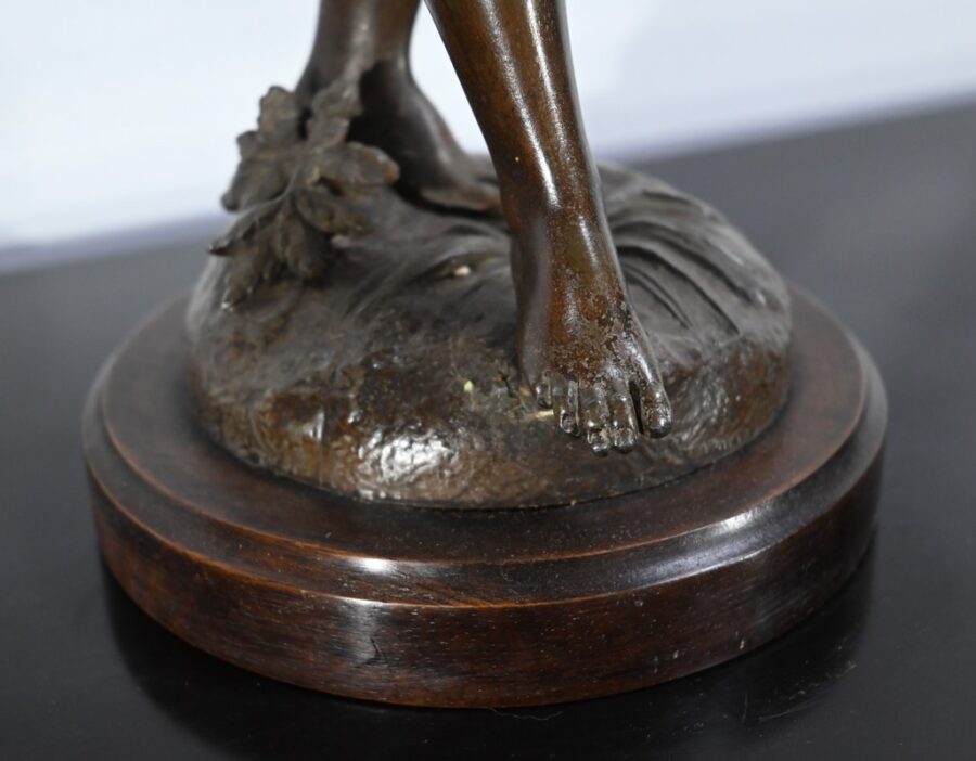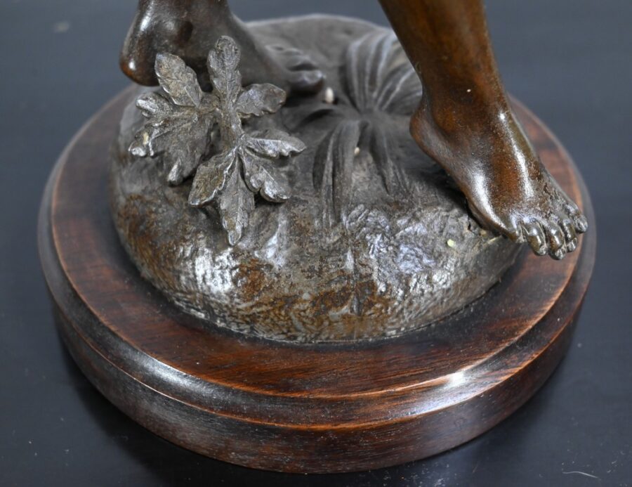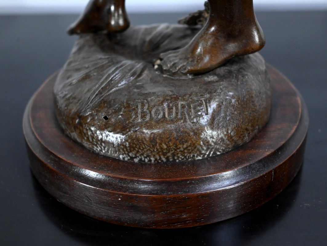 Sujet en régule à patine brune signé Eutrope Bouret (1833-1906). Bouret est un sculpteur français connu pour ses nombreuses œuvres notamment la statue en marbre représentant Psyché au tribunal de Vénus.