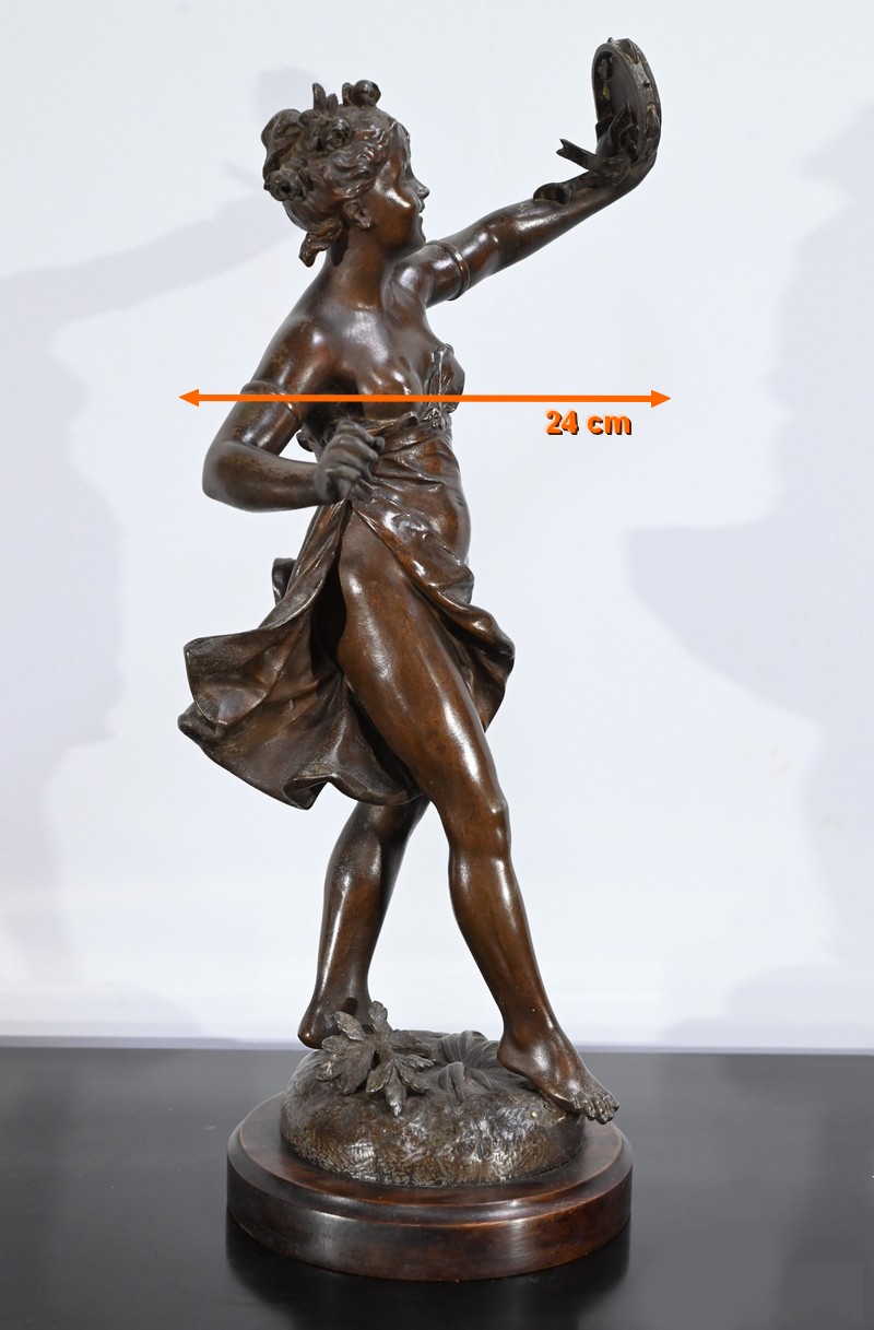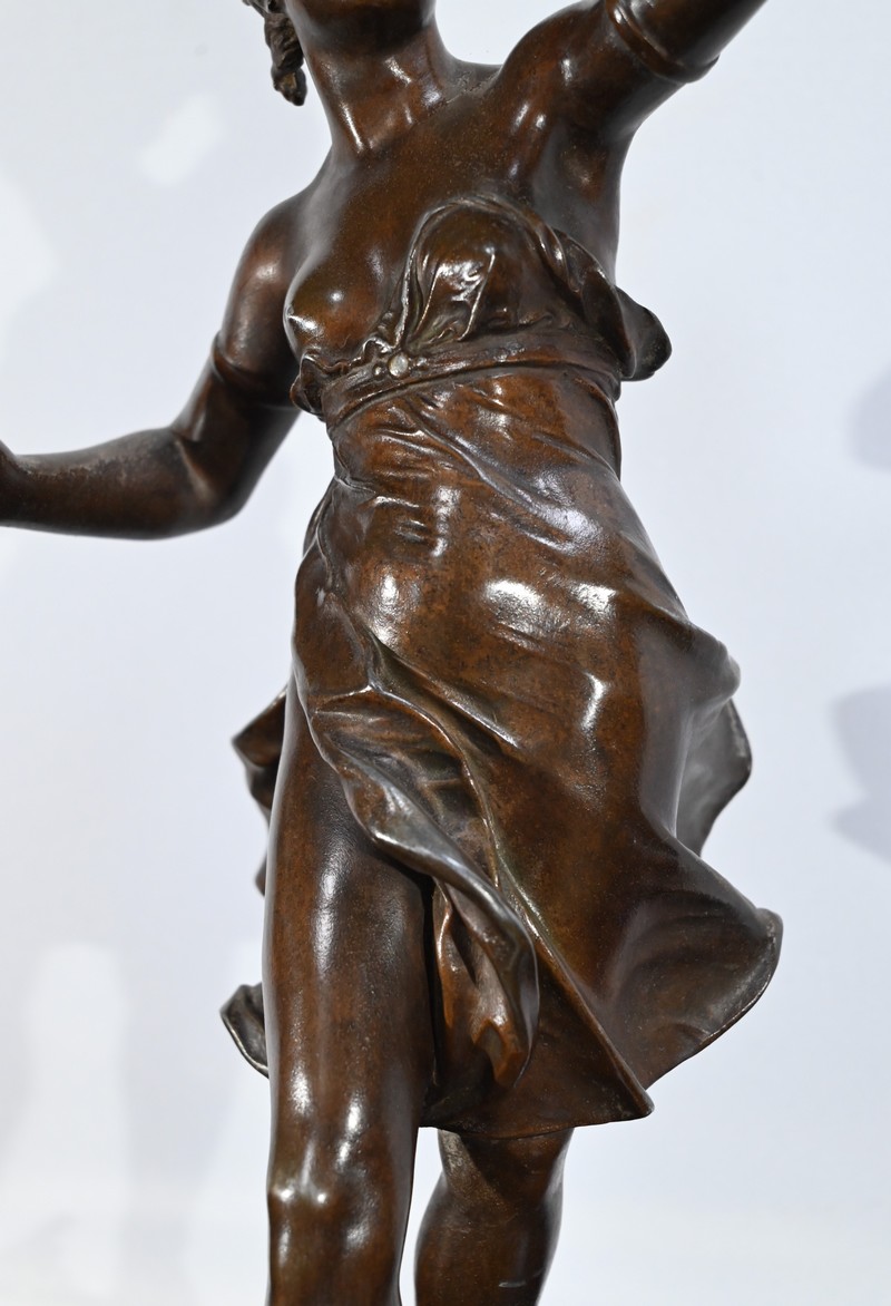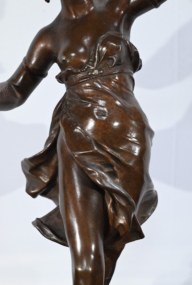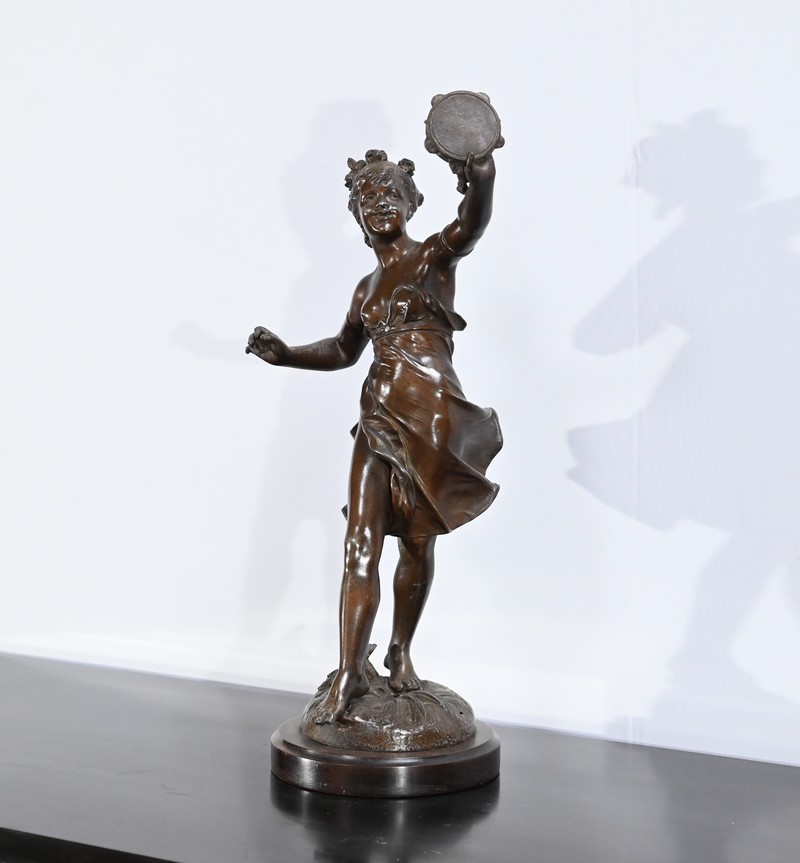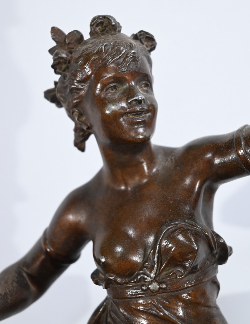 Sujet en régule à patine brune signé Eutrope Bouret (1833-1906). Bouret est un sculpteur français connu pour ses nombreuses œuvres notamment la statue en marbre représentant Psyché au tribunal de Vénus.