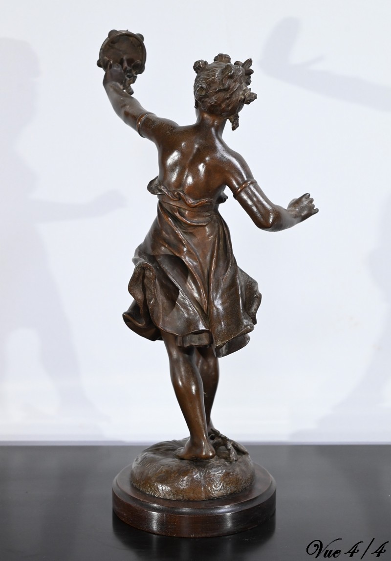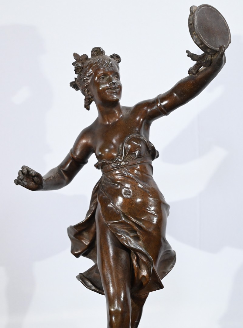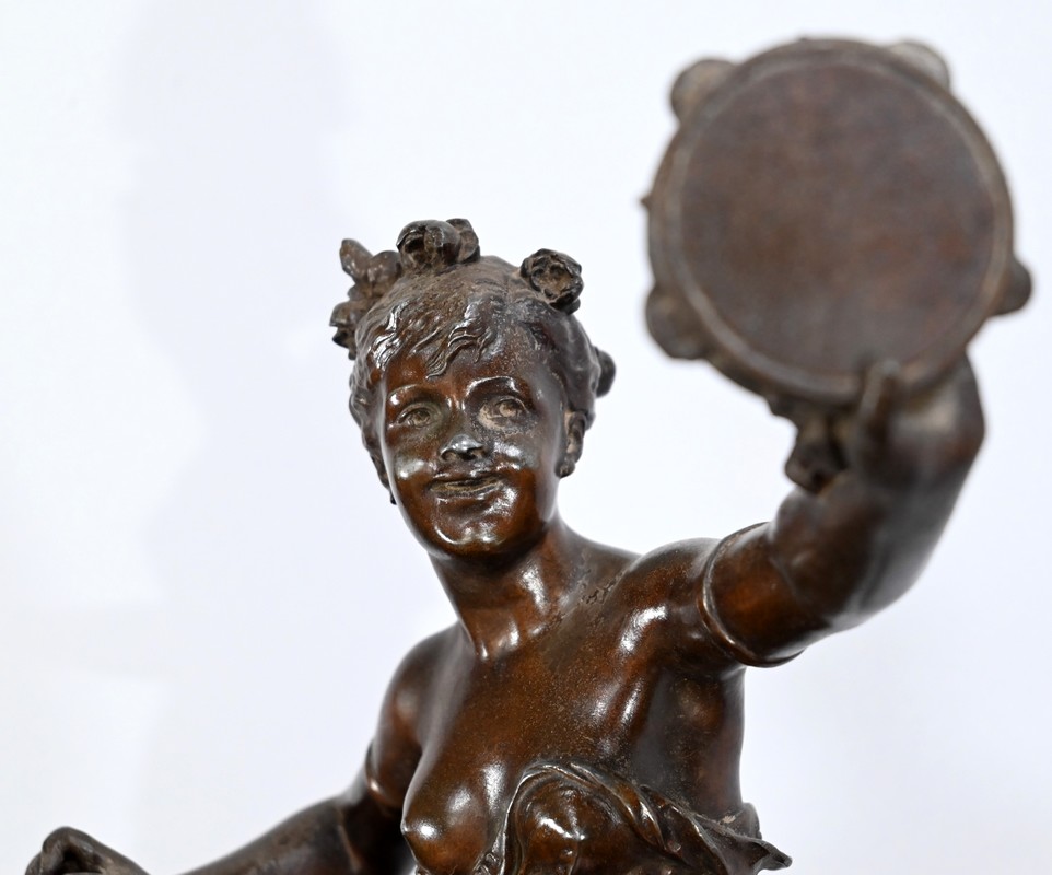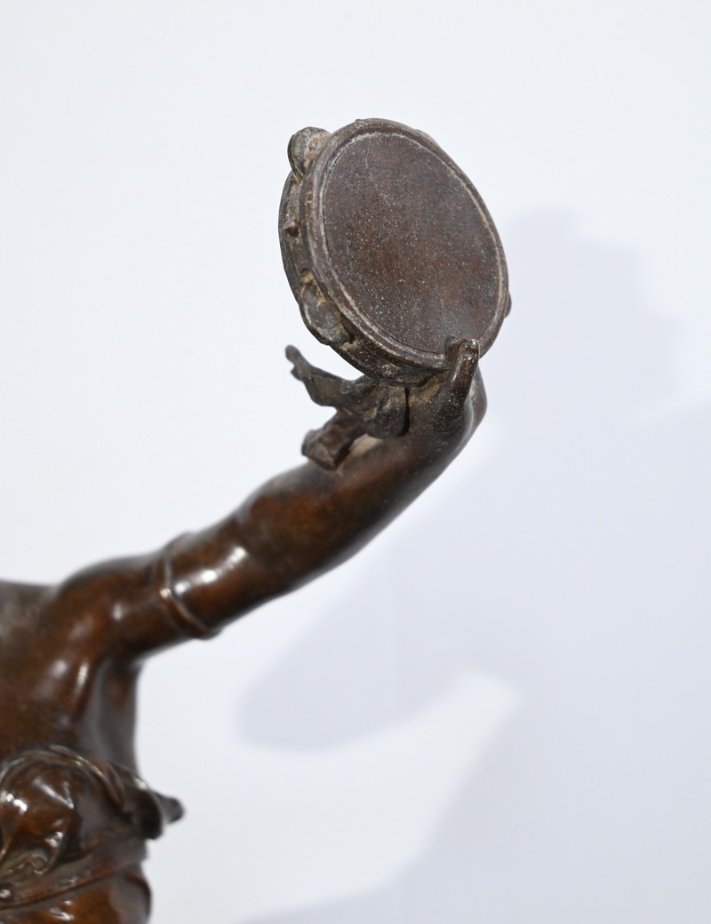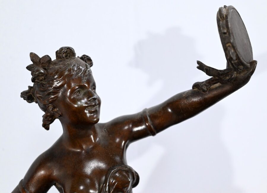Ce sujet représente une jeune danseuse, coiffée de roses, vêtue d’un léger drapé dévoilant partiellement sa poitrine. Cette femme, au visage joyeux, lève un tambourin au dessus de sa tête.