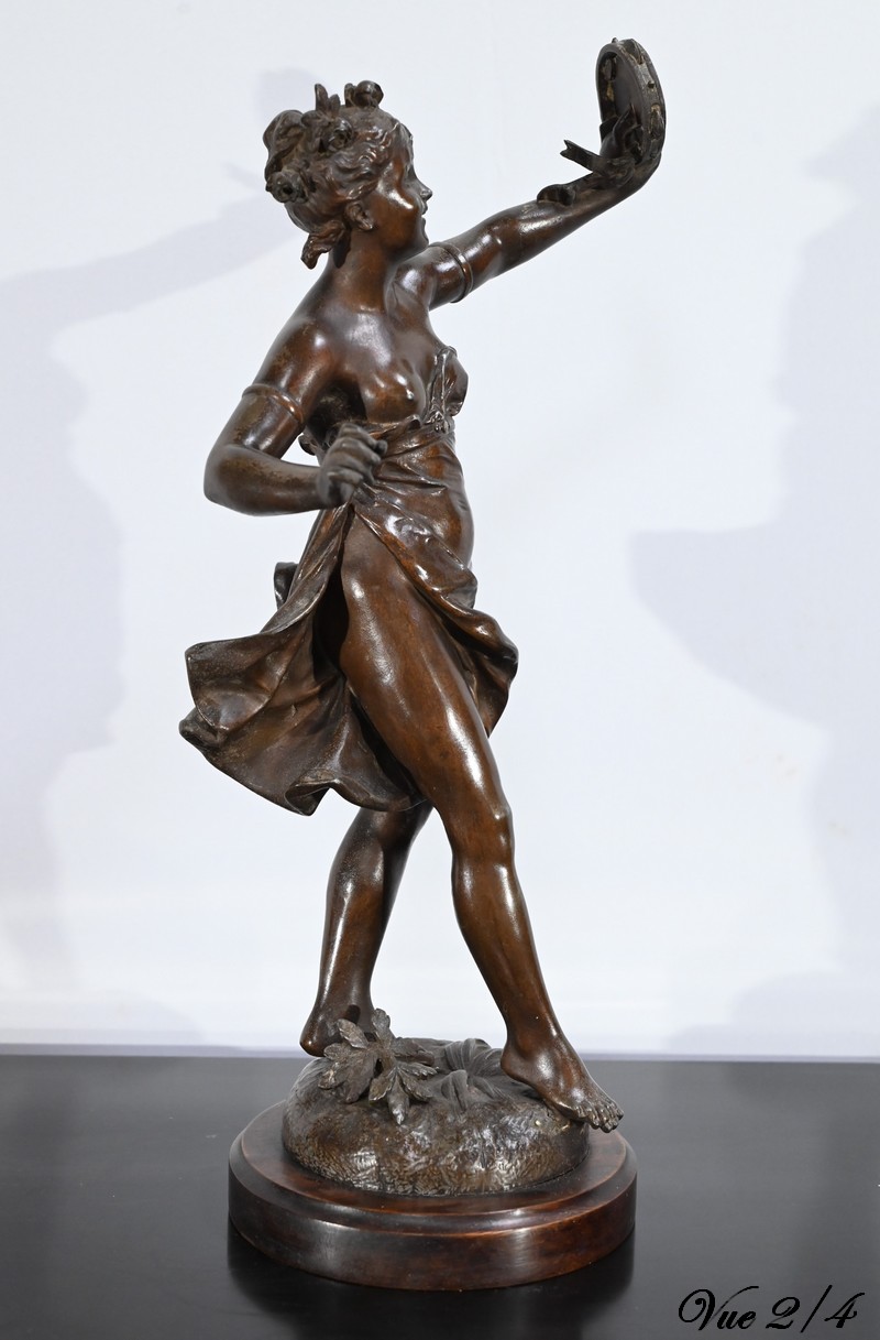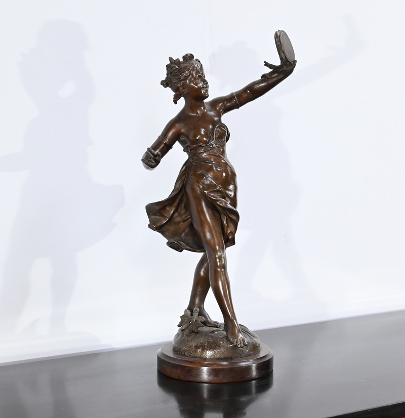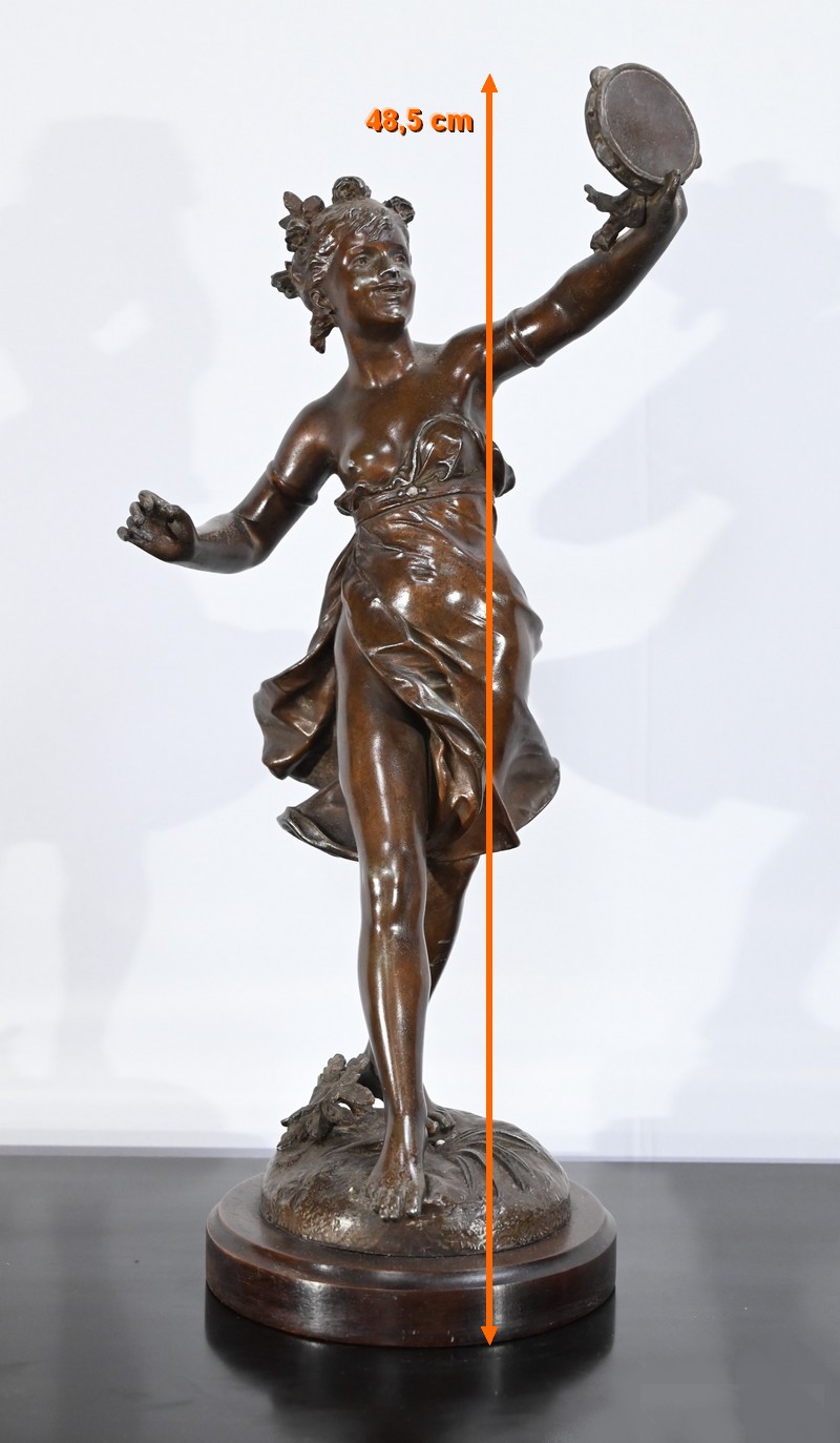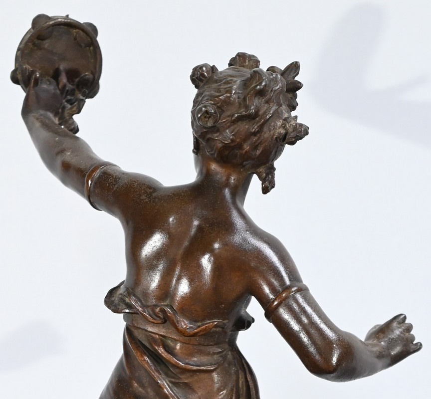 Ce sujet représente une jeune danseuse, coiffée de roses, vêtue d’un léger drapé dévoilant partiellement sa poitrine. Cette femme, au visage joyeux, lève un tambourin au dessus de sa tête.