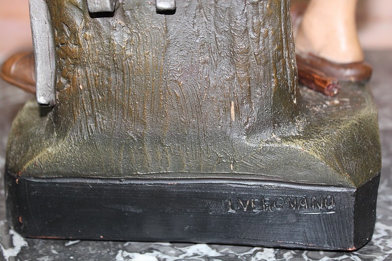 Terre cuite peinte sur socle représentant un maréchal-ferrant au travail , elle est titrée sur un cartel ‘La Paix c’est le Travail – par L. Vergnano’. Elle est signée ‘L. VERGNANO’ sculpteur Italien de Turin.