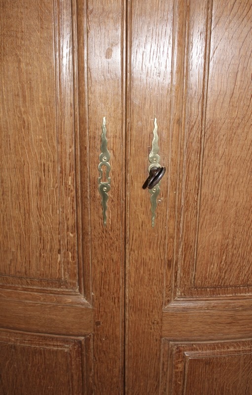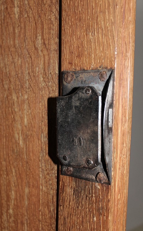 Traverse basse chantournée, fiches à pans coupés en cuivre et serrure d’origine.
