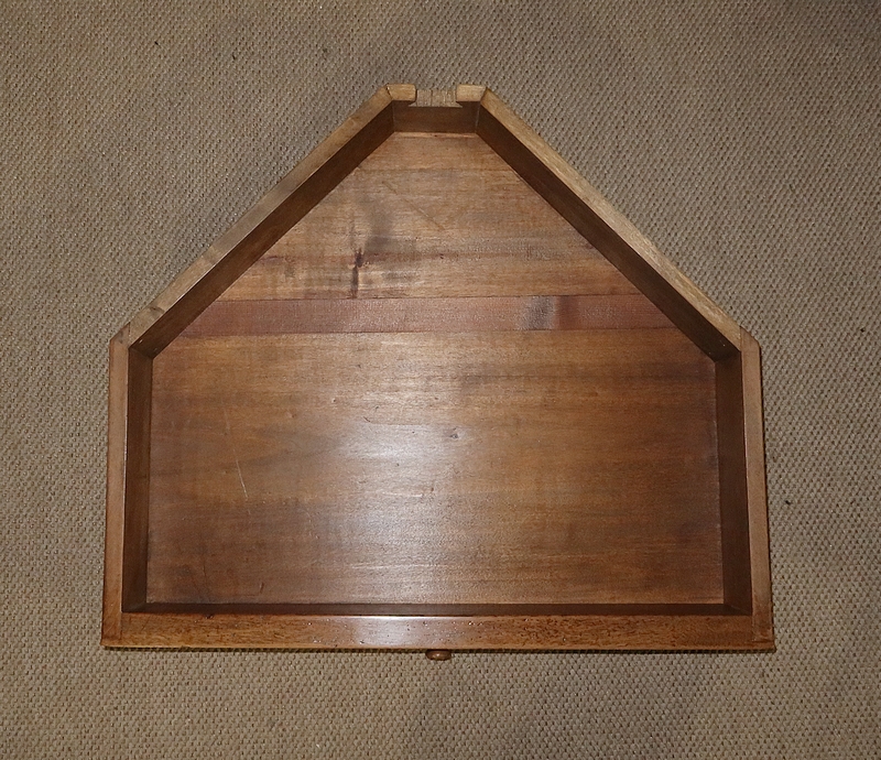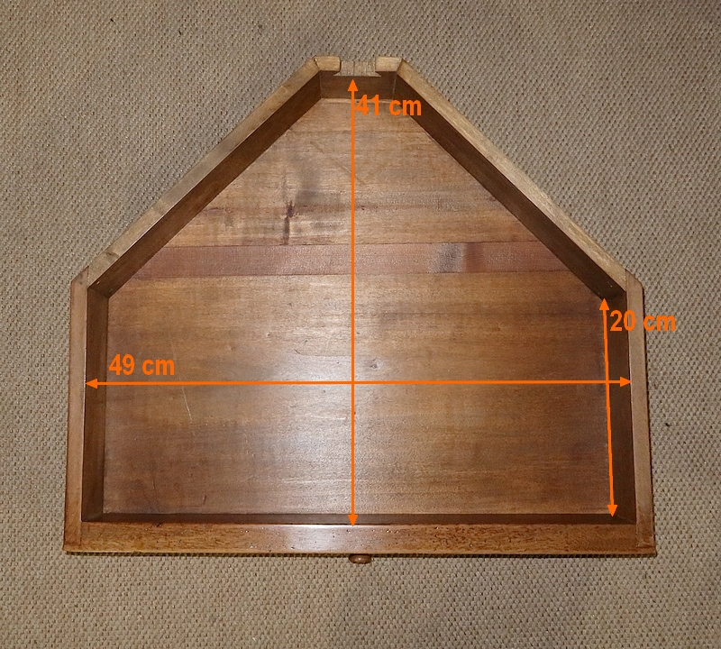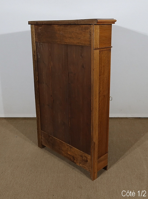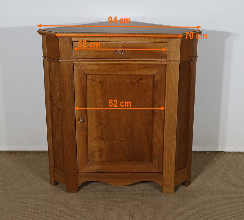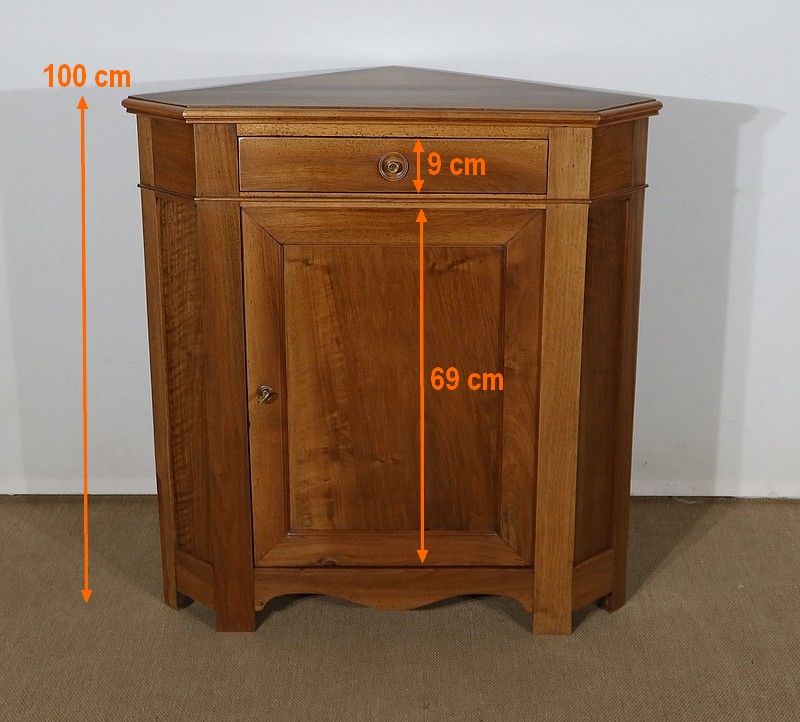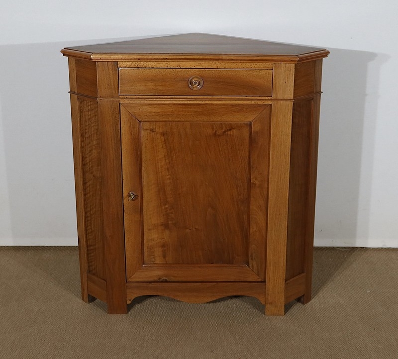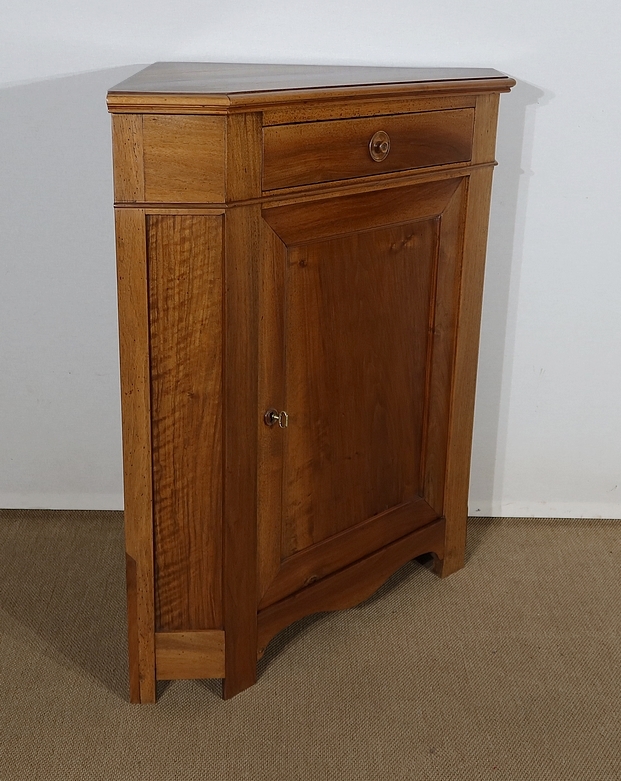 Encoignure en Noyer massif composée en façade d’un tiroir en partie haute s’ouvrant avec un bouton cuvette et d’une porte se tirant vers la droite. Cette porte présente un encadrement à coupe d’onglet et une légère moulure vers l’intérieur. Le panneau central est composé d’un seule planche en noyer, sans joint. La serrure et la clé ancienne sont en état de fonctionnement et l’entrée est en bois. A l’ouverture, nous découvrons une étagère réglable sur crémaillère.