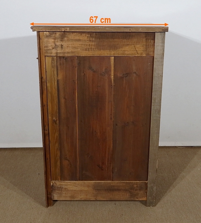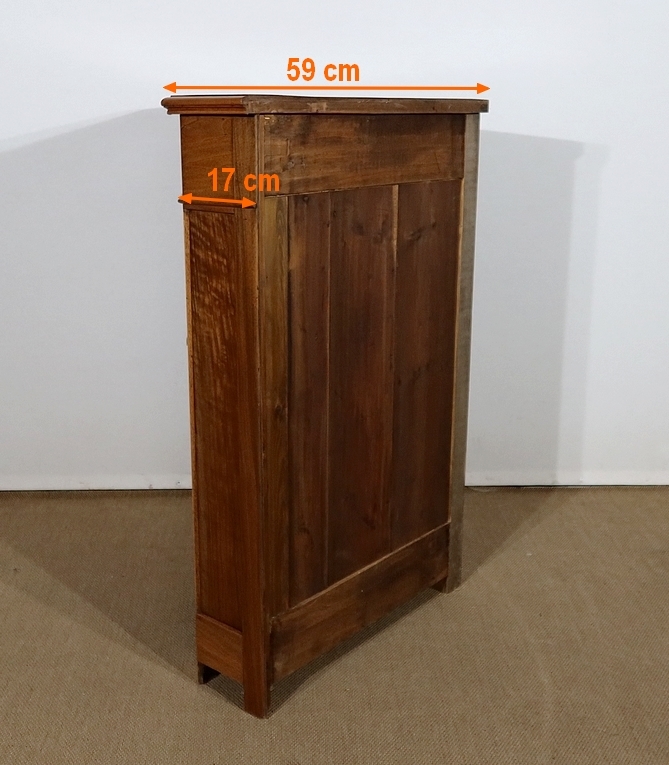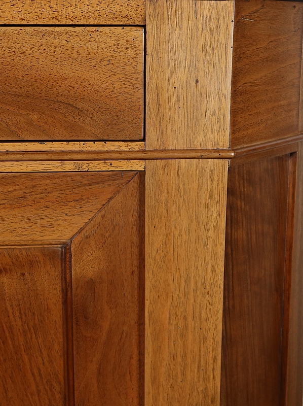 Sur les côtés, deux petits panneaux à réserve apportent une touche d’originalité à cette encoignure élégante. Le dessus en Noyer massif est muni d’une moulure en bec de corbin et d’une gorge à retour.