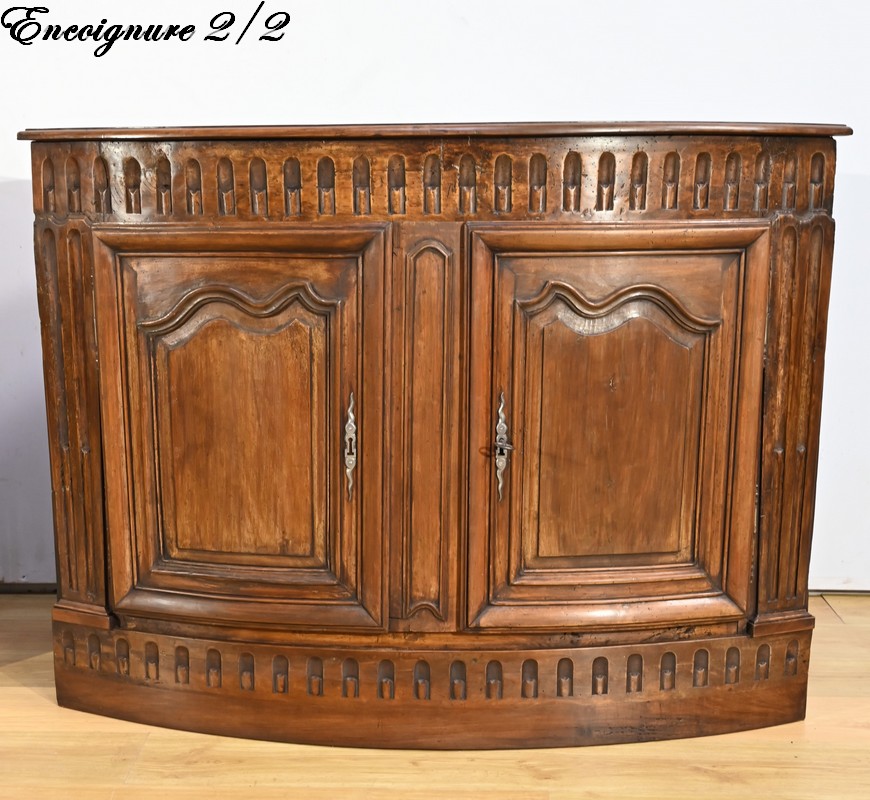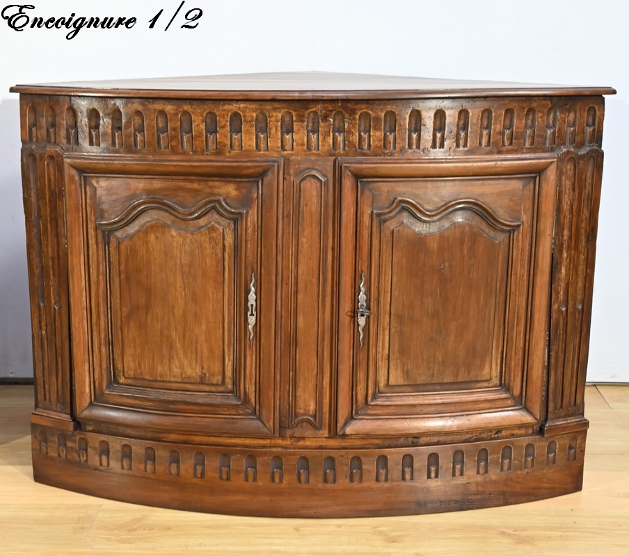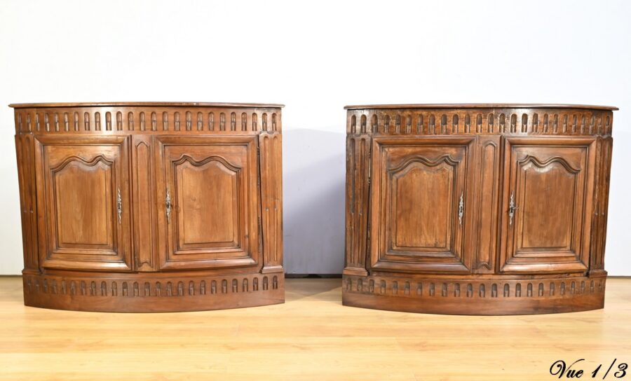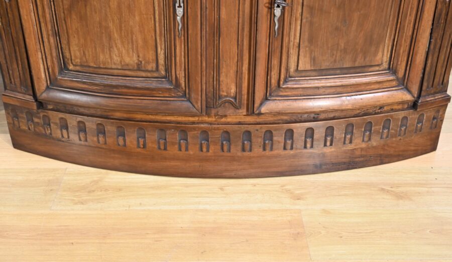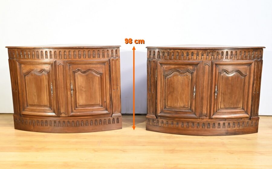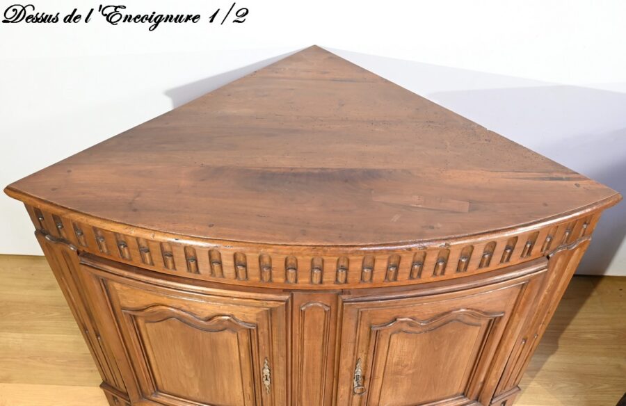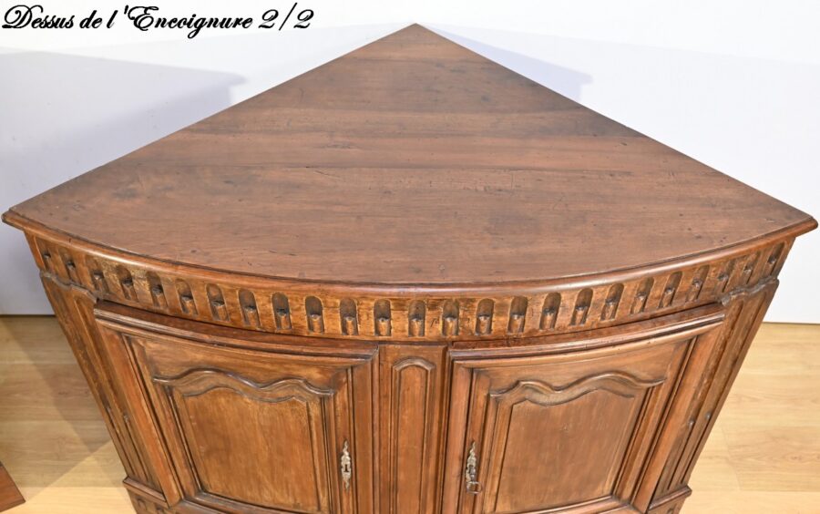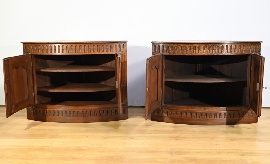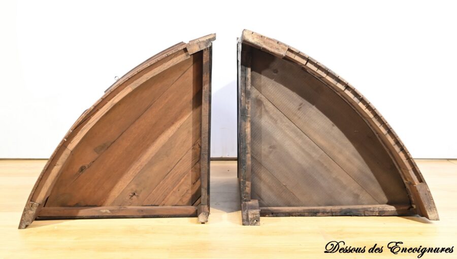 Chaque encoignure, de forme cintrée en façade, ouvre par deux portes foncées de panneaux à platebandes, moulurées dans le pourtour et à l’intérieur dans la masse.