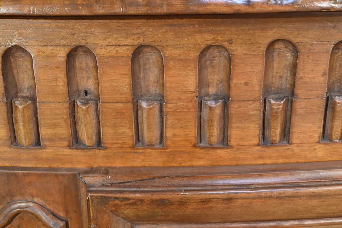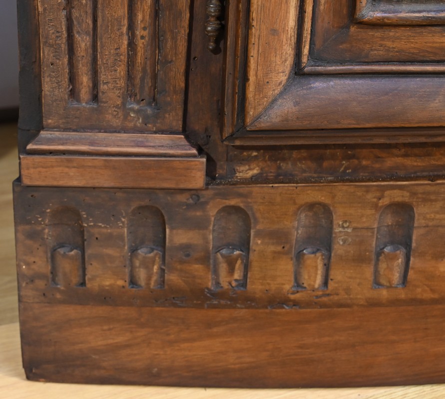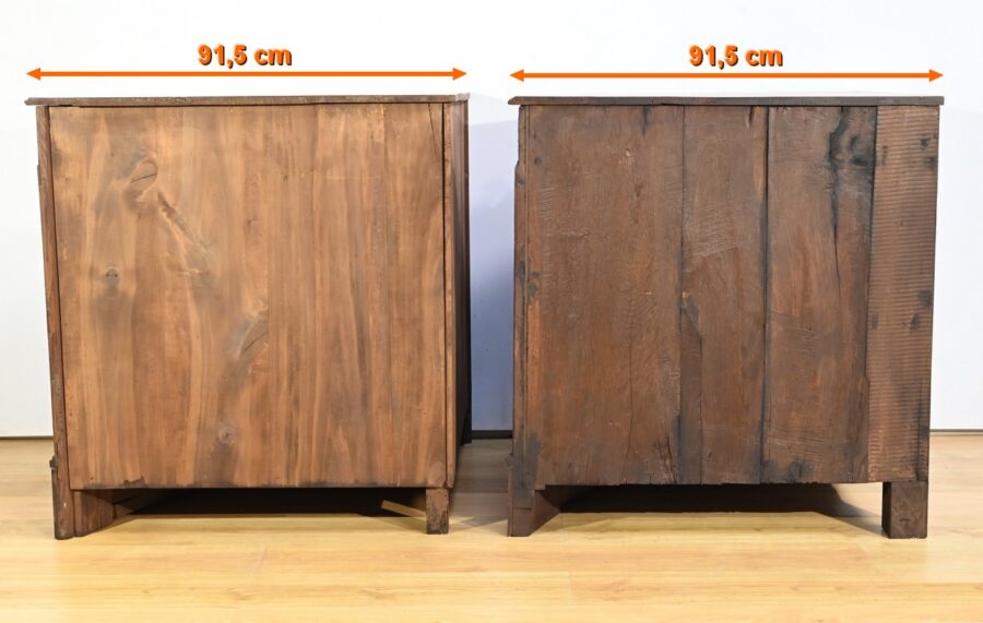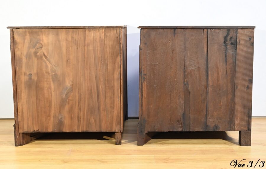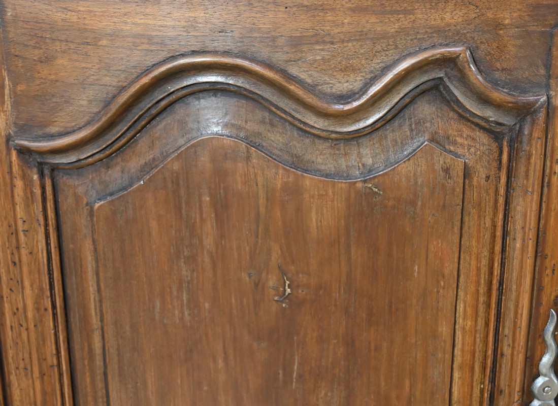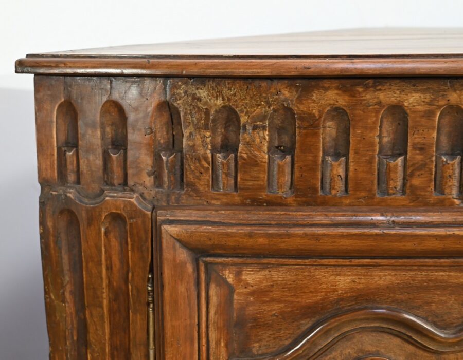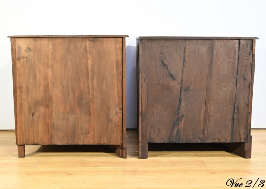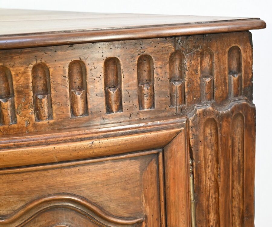 Chaque encoignure, de forme cintrée en façade, ouvre par deux portes foncées de panneaux à platebandes, moulurées dans le pourtour et à l’intérieur dans la masse.