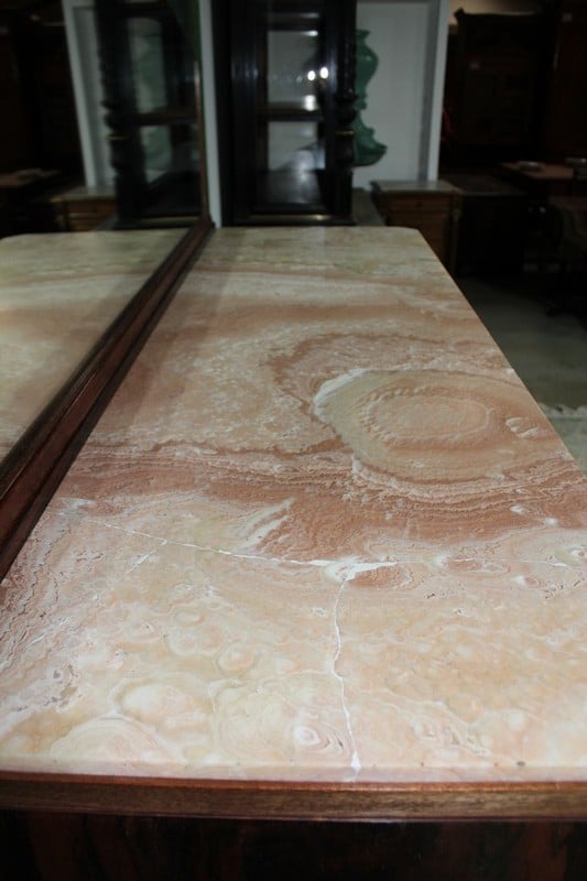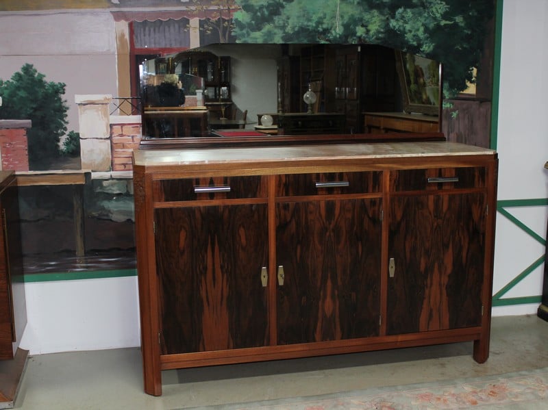 Buffet-enfilade en placage de palissandre ouvrant par 3 portes et 3 tiroirs. Le plateau, en onyx, est surmonté d’un miroir. Une fleur est sculptée sur les montants en acajou. CIRCA 1940.