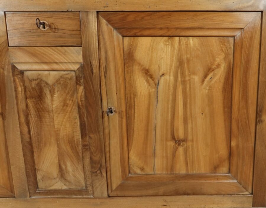 Belle enfilade en noyer massif, de faible profondeur, composée en façade de deux larges portes à encadrement à coupe d’onglet avec mouluration intérieure, foncées de panneaux disposés en livre ouvert, apportant symétrie et harmonie. Ses portes sont agrémentées de clés et serrures d’origine en état de fonctionnement, accompagnées d’entrées bois. Elles ouvrent sur un espace de rangement avec étagères réglables sur crémaillères. Au milieu de ce meuble, un tiroir en partie haute est également muni d’une serrure d’origine avec entrée bois. En dessous, un pilastre est composé de noyer au veinage subtil, disposé en livre ouvert.
