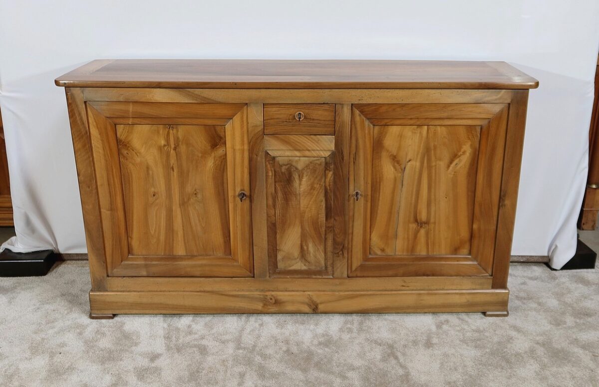 Belle enfilade en noyer massif, de faible profondeur, composée en façade de deux larges portes à encadrement à coupe d’onglet avec mouluration intérieure, foncées de panneaux disposés en livre ouvert, apportant symétrie et harmonie. Ses portes sont agrémentées de clés et serrures d’origine en état de fonctionnement, accompagnées d’entrées bois. Elles ouvrent sur un espace de rangement avec étagères réglables sur crémaillères. Au milieu de ce meuble, un tiroir en partie haute est également muni d’une serrure d’origine avec entrée bois. En dessous, un pilastre est composé de noyer au veinage subtil, disposé en livre ouvert.