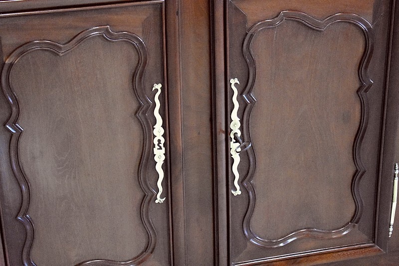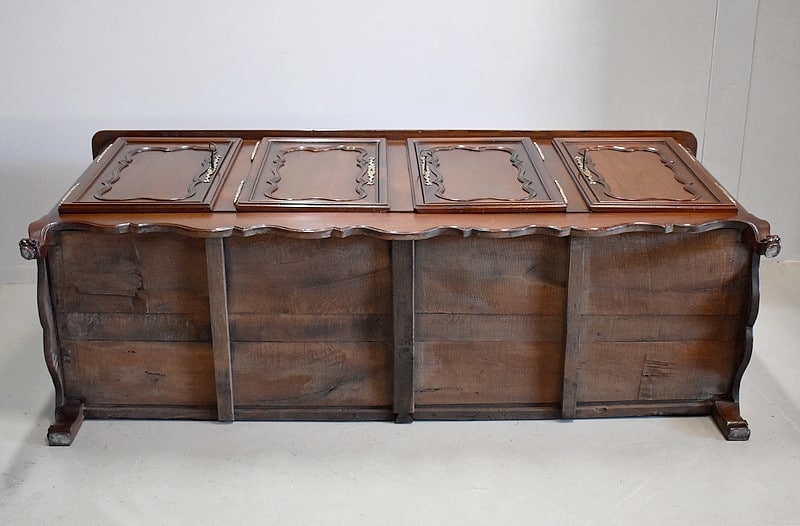 Elle ouvre par 4 portes fermant à clef dont les ferrures et serrures sont d’origine , celles-ci sont découpées et moulurées en défoncement. Une porte en partie gauche, deux portes pour la partie centrale et une porte à droite. Toutes donnent accès à une étagère intérieure posée sur tasseaux fixes.