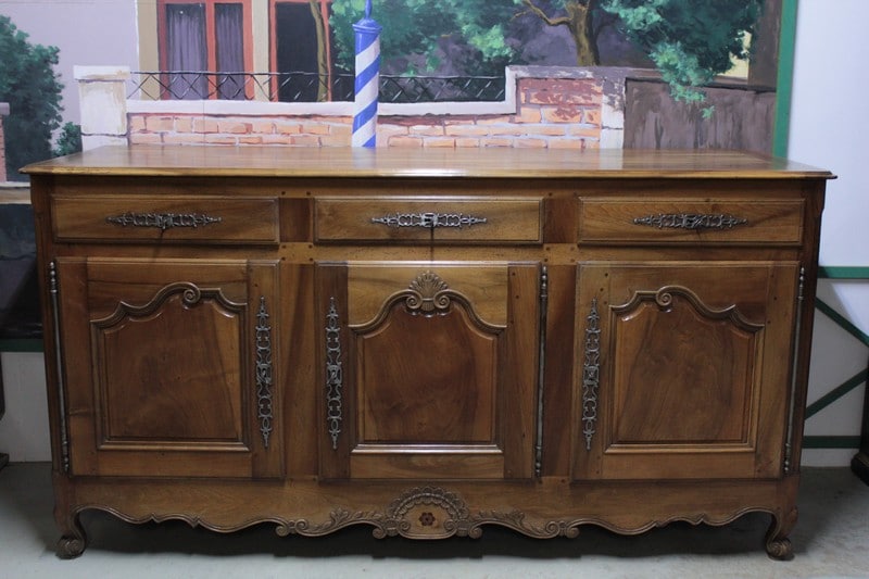 Magnifique enfilade Louis XV en noyer ouvrant à 3 portes et 3 tiroirs. Les fiches et les entrées de serrures sont en fer. Les pieds avants sont à enroulement. La traverse basse est chantournée avec un joli décor de feuilles et une marqueterie au milieu. Région des Pays de Loire , fin du XVIIIe.