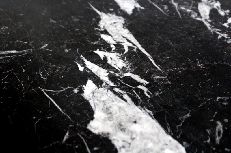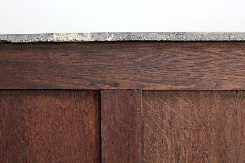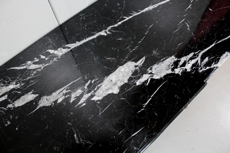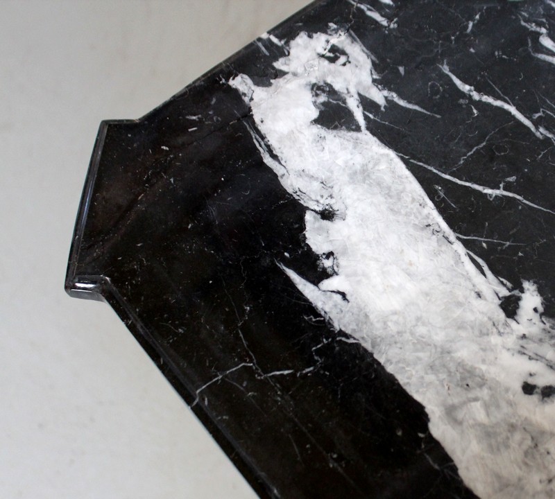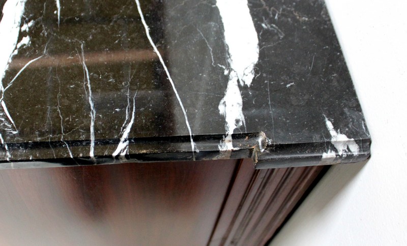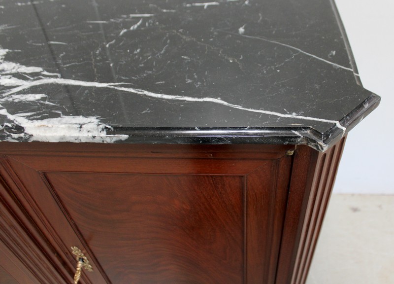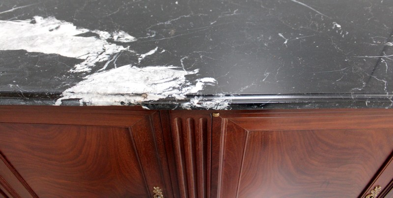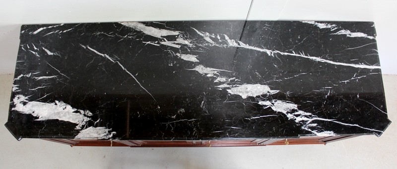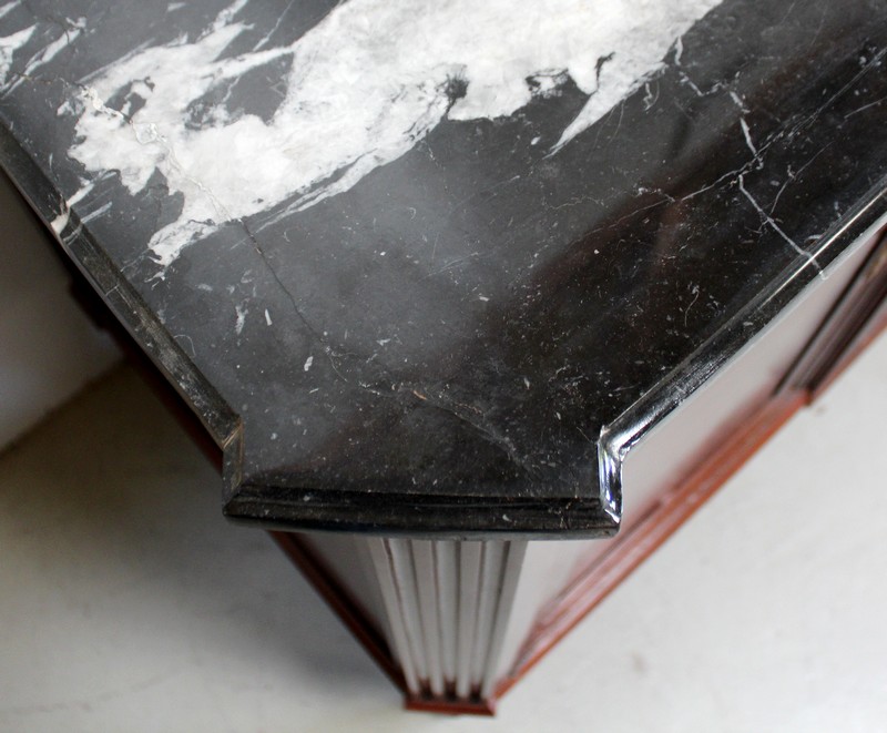 Ce Meuble de Port Nantais est agrémenté sur son Dessus d’un Magnifique Marbre Flammé d’un Noir profond veiné de Blanc. Présentant des Ressauts sur ses côtés avant et arrière ainsi qu’en son centre, ce Plateau est souligné par une Gorge en son pourtour.