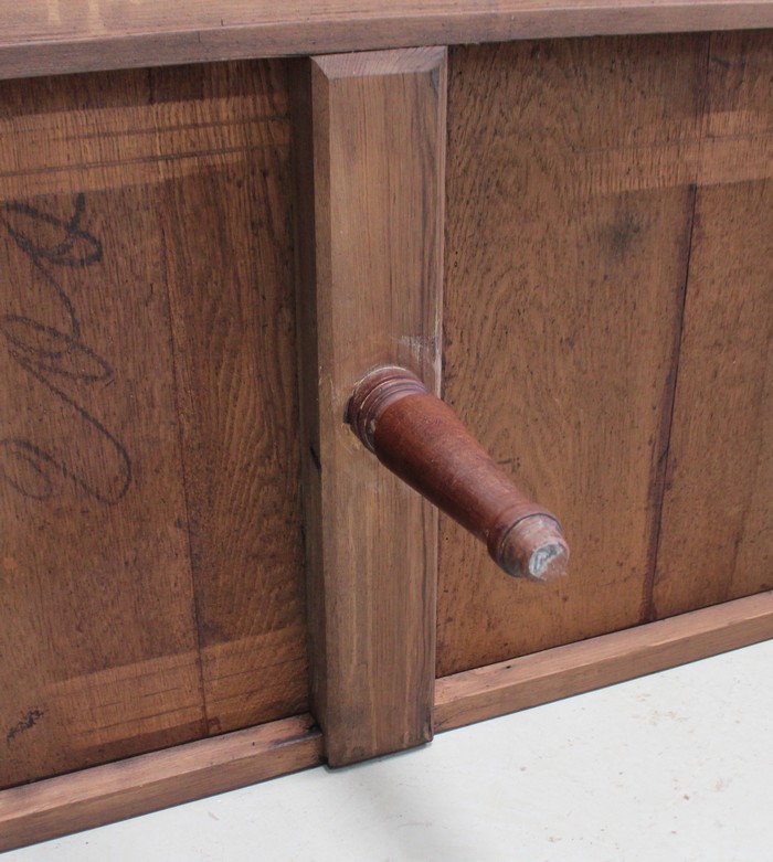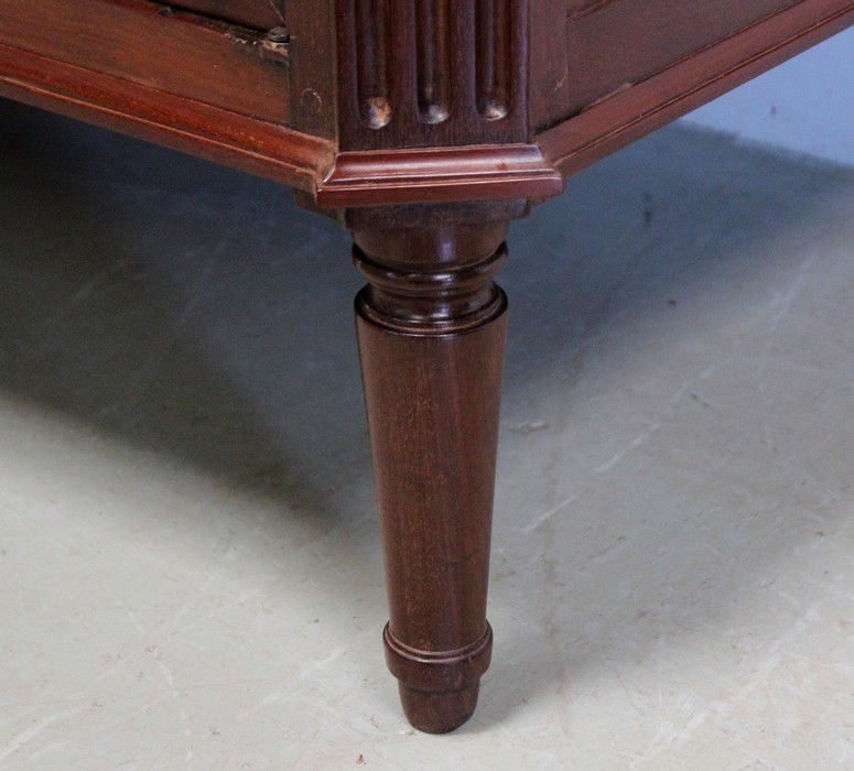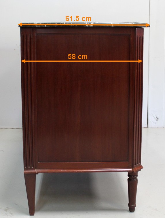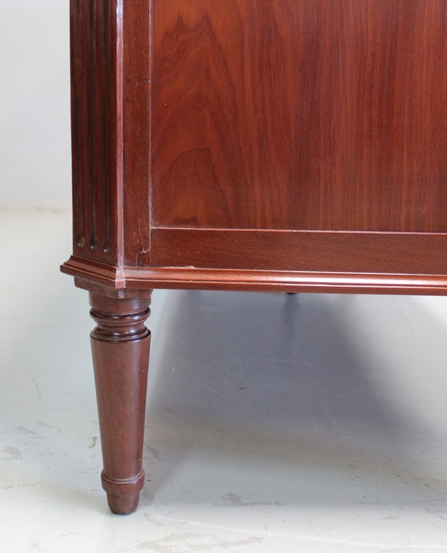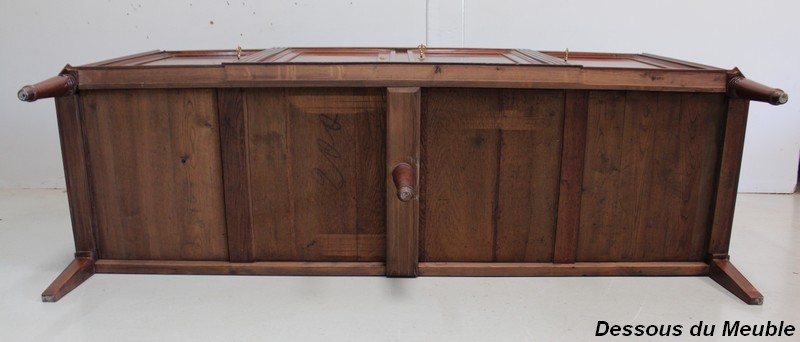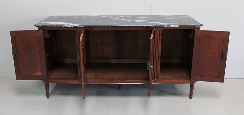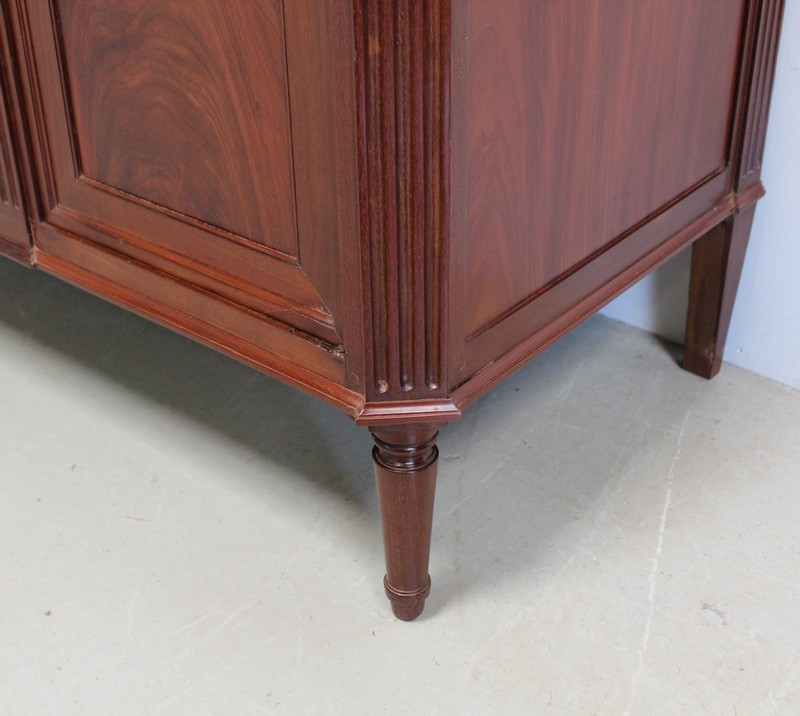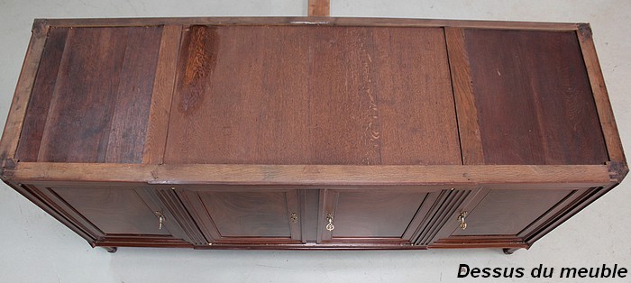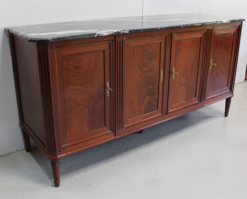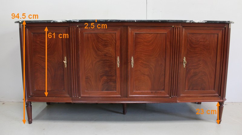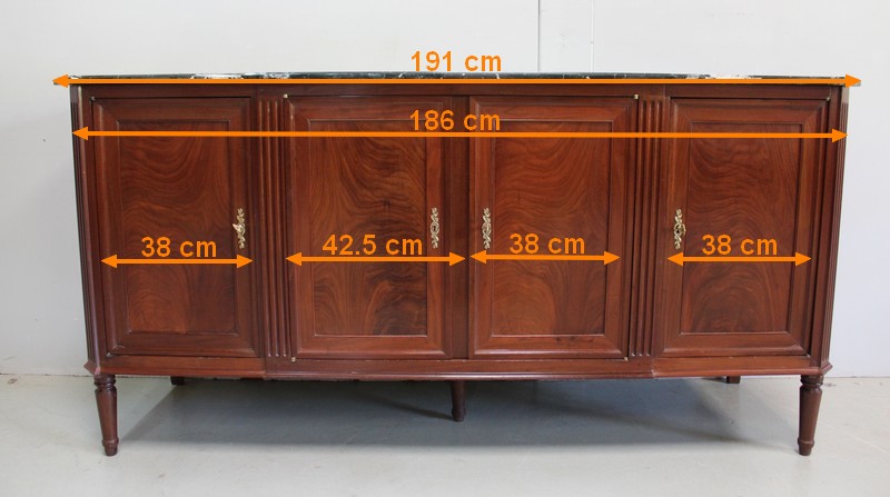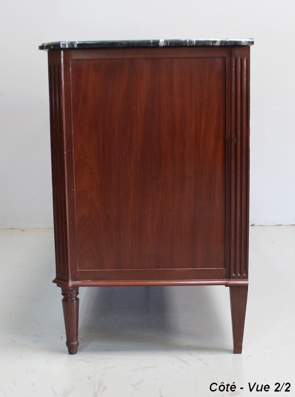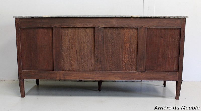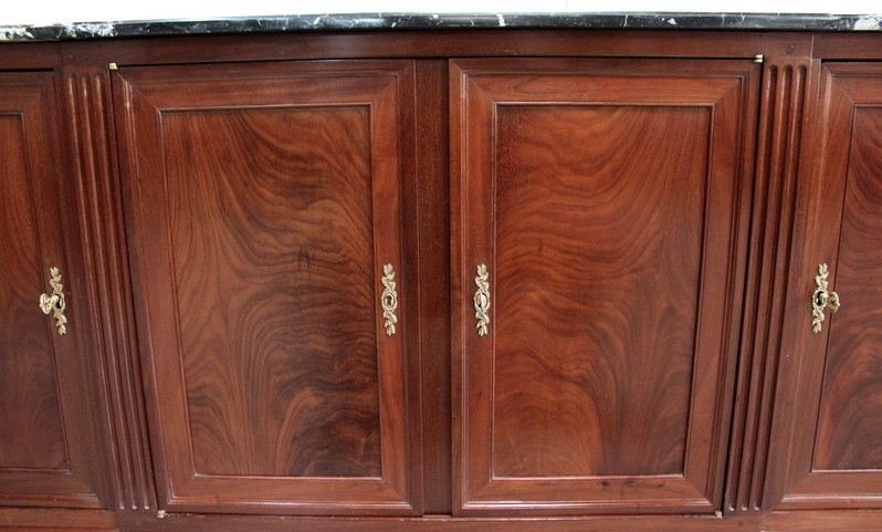 Le Corps de ce Meuble suit les lignes du Marbre et présente des Ressauts au centre et sur chaque côté. A l’avant il offre deux Pieds à Pans Coupés et Cannelés se terminant en Bois tourné. Les Flancs de cette Enfilade sont constitués d’un seul grand Panneau en Acajou massif, l’arrière quant à lui est en Chêne.