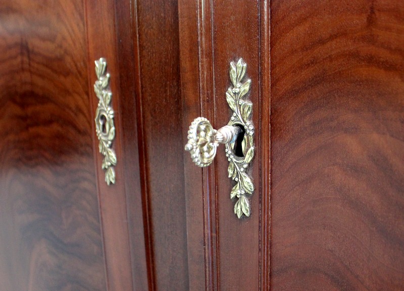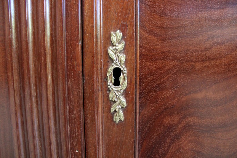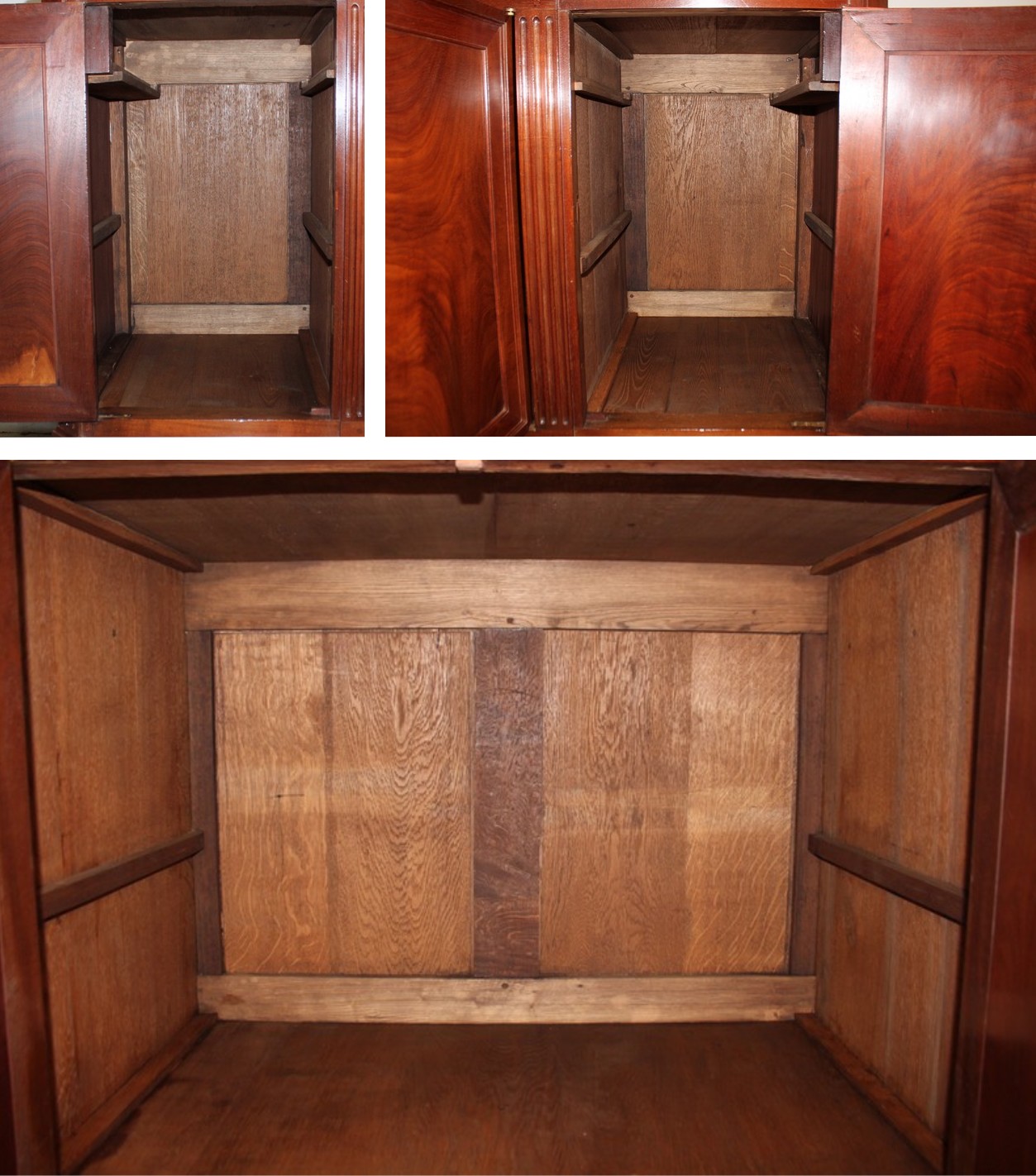 La Façade parfaitement Symétrique de cette Enfilade Unique est dotée de Quatre Portes à Coupe d’Onglet et à Défoncement, composées d’un seul panneau d’Acajou de Cuba légèrement Ronceux. Entourées de Montants à larges Cannelures séparant la partie centrale des côtés, ces Portes sont munies de Serrure en Fer et Laiton en état de fonctionnement, accompagnée de leur Clé respective. À l’intérieur, nous découvrons trois Étagères positionnées sur Tasseaux, deux Tiroirs à couverts .viennent compléter la capacité de rangement de ce Bien.