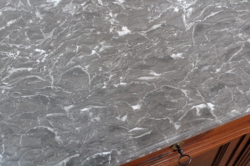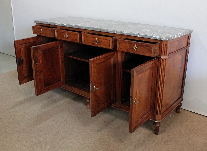 Ce meuble de la région nantaise est agrémenté sur son dessus d’un magnifique marbre gris veiné de blanc postérieur à l’époque. Présentant des ressauts aux angles ainsi qu’en son centre, ce plateau est souligné par une gorge en son pourtour.