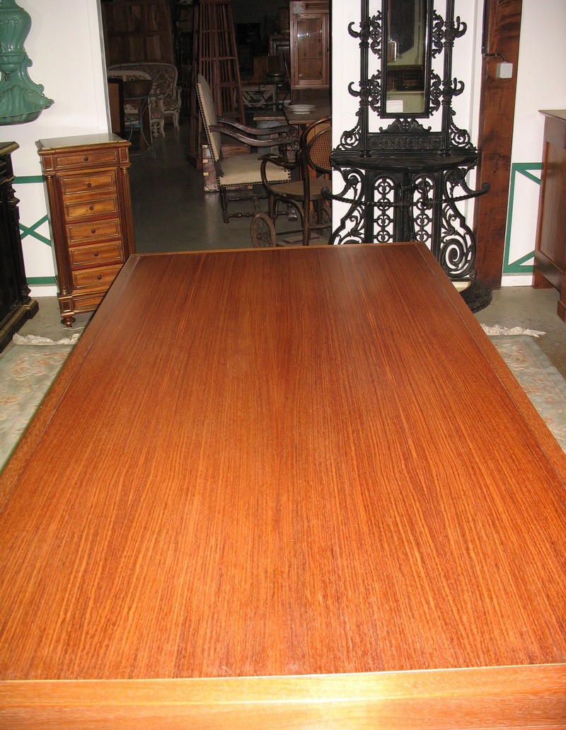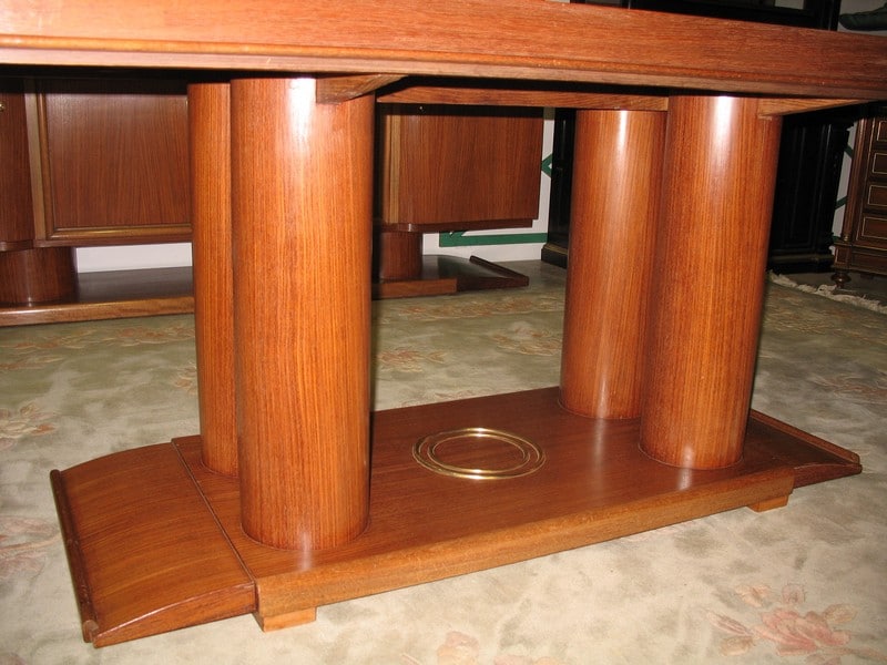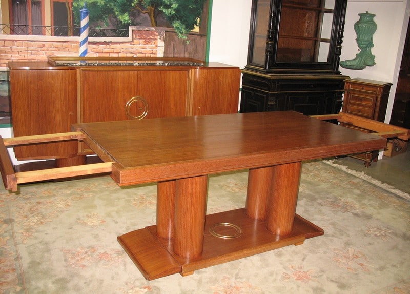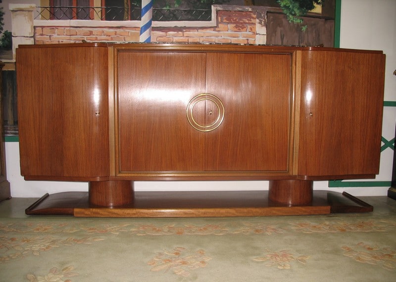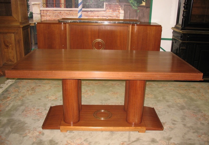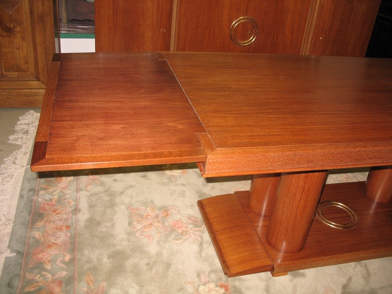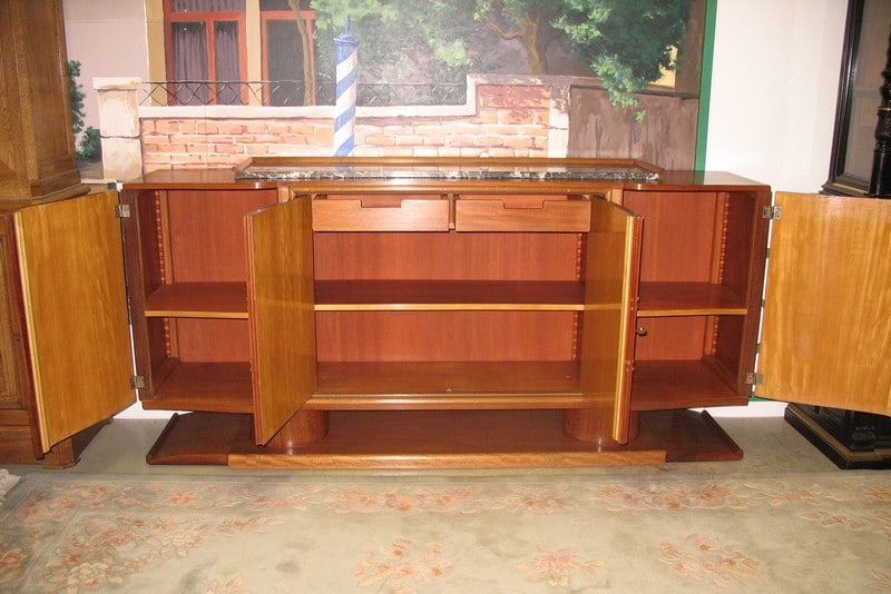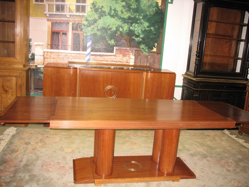 Originale Salle à Manger ART DÉCO en placage de Palissandre, composée d’une enfilade 4 portes et 2 tiroirs intérieurs, et d’une table rectangulaire reposant sur 4 pieds en colonnes. La moulure d’encadrement des portes centrales et du socle est en acajou massif. L’intérieur est en placage d’acajou blond. Dessus en marbre gris veiné blanc. Époque 1930.