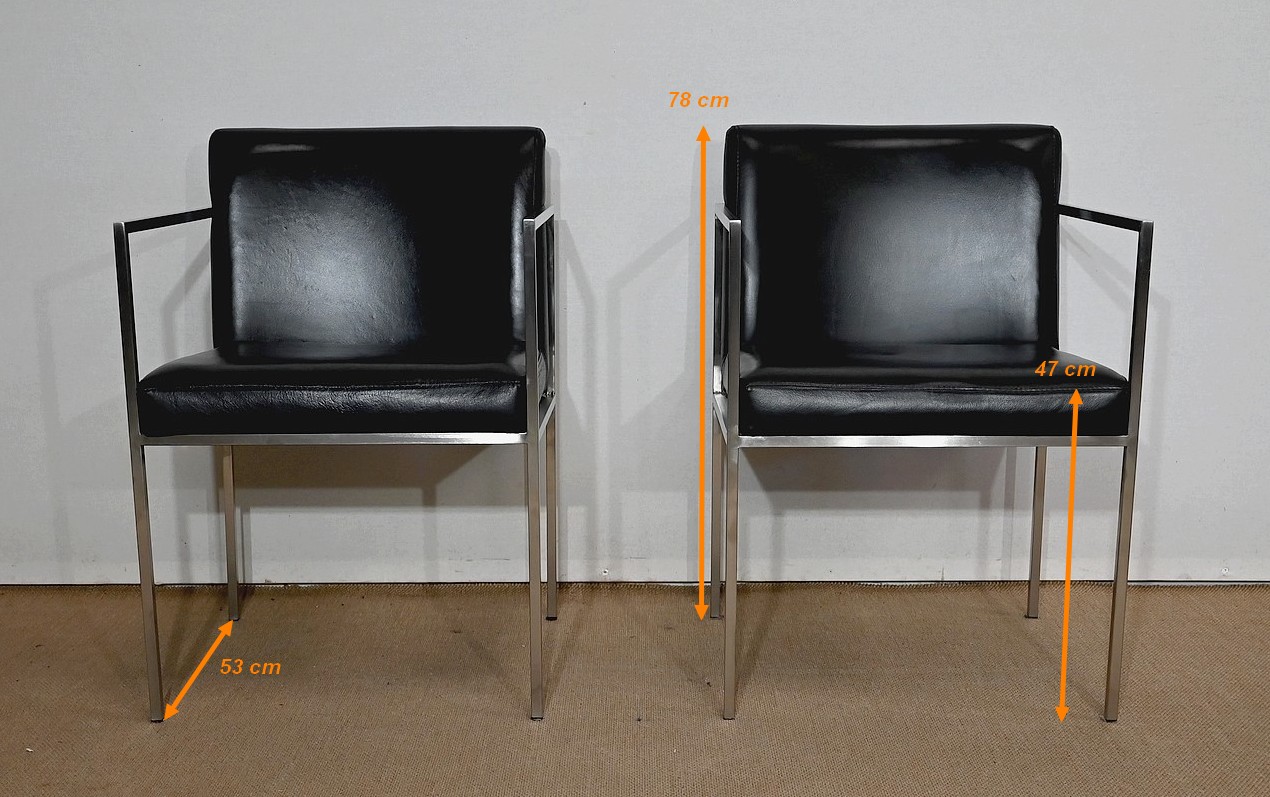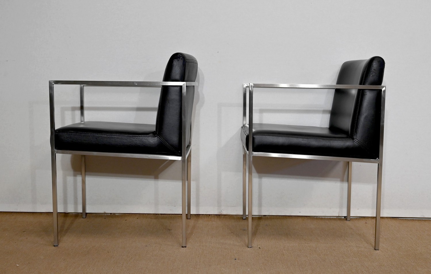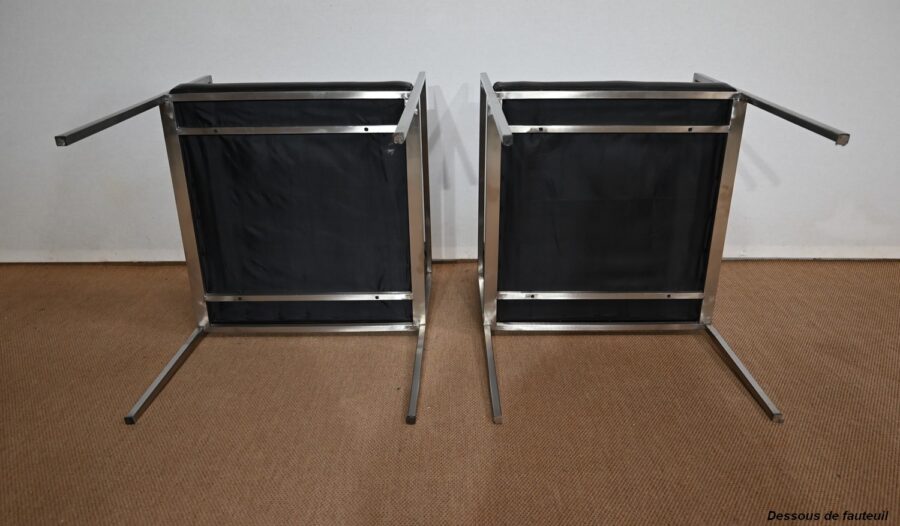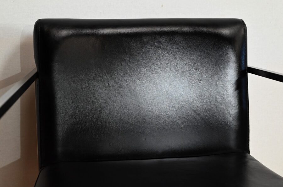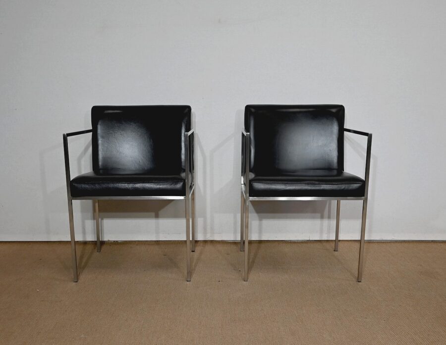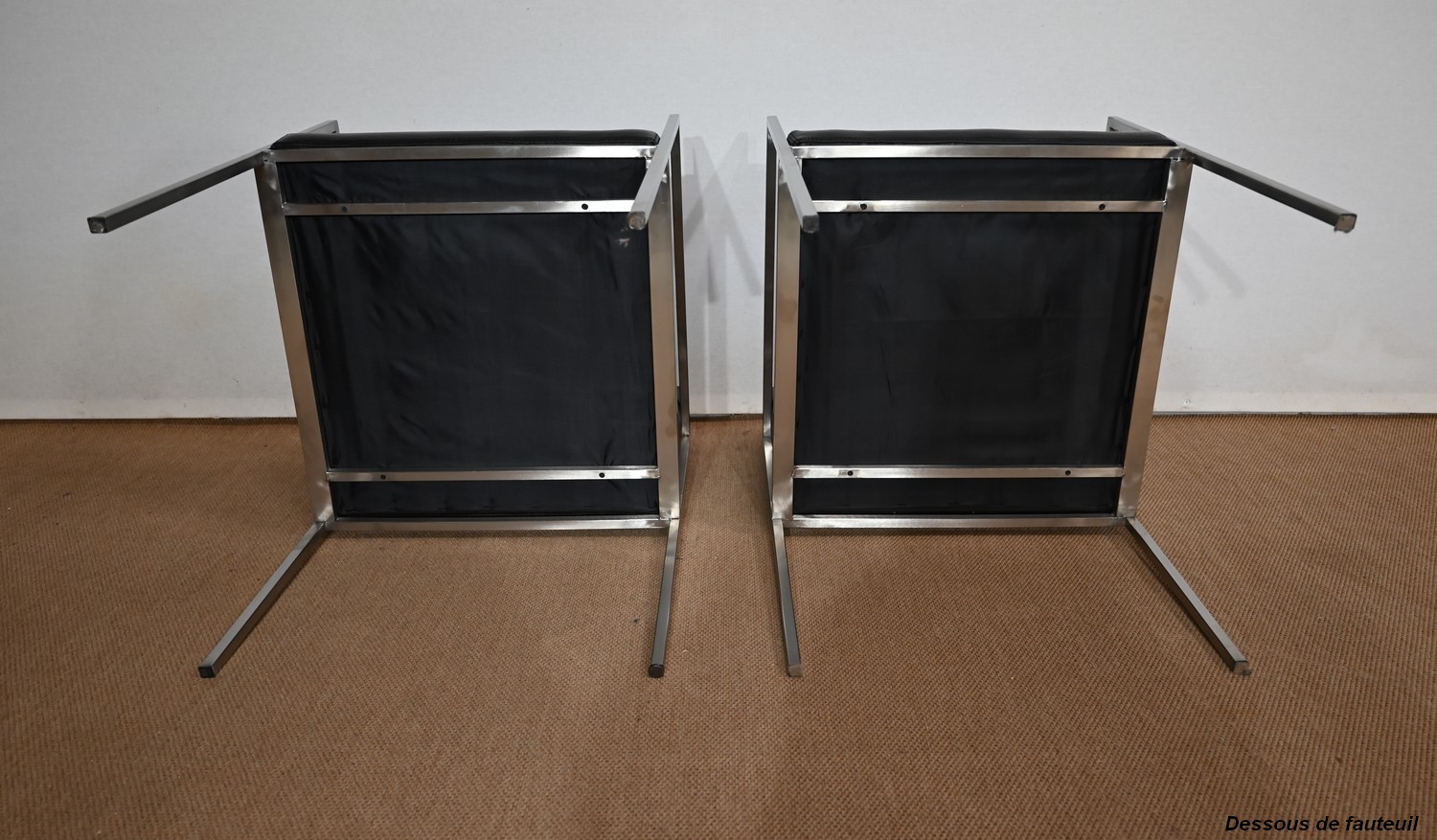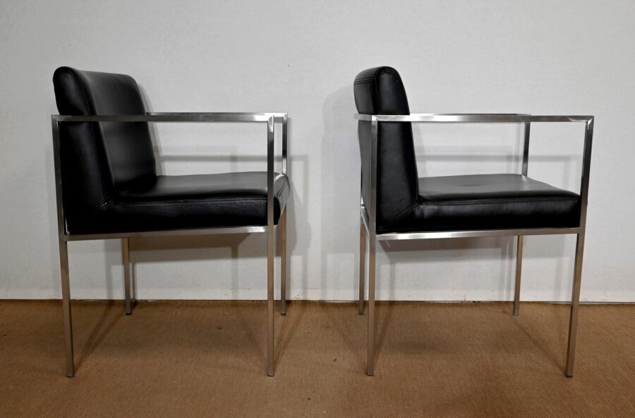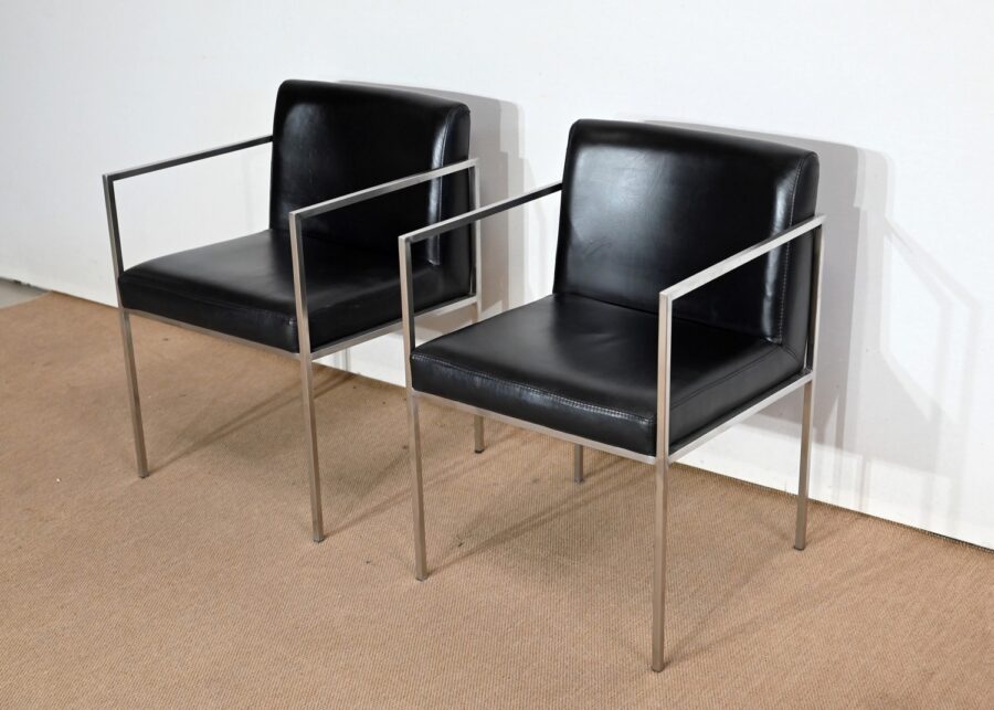 Cette paire de fauteuils, au dossier et à l’assise rectangulaires, en simili cuir noir à piqûres, possède une ossature en métal brossé. Celle-ci, légère et aérienne, aussi bien dans la partie supérieure que dans le piètement, confère une simplicité, qui leur permet de s’inviter dans n’importe quel intérieur.