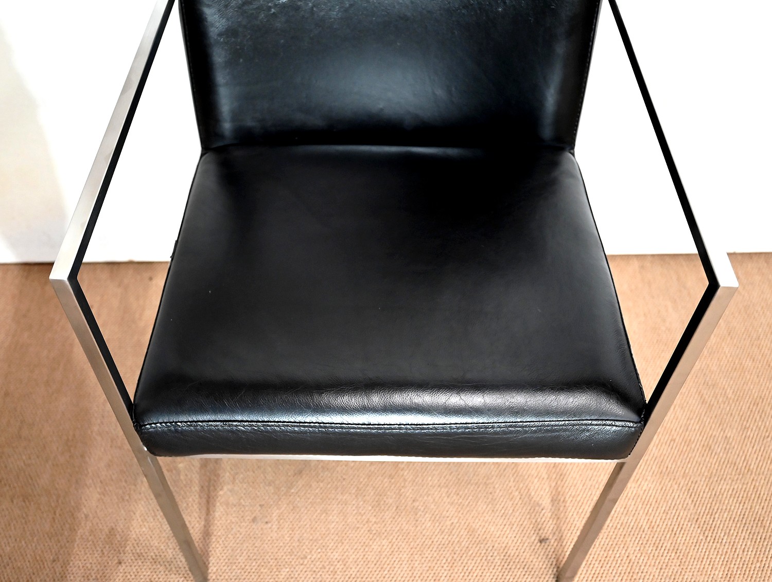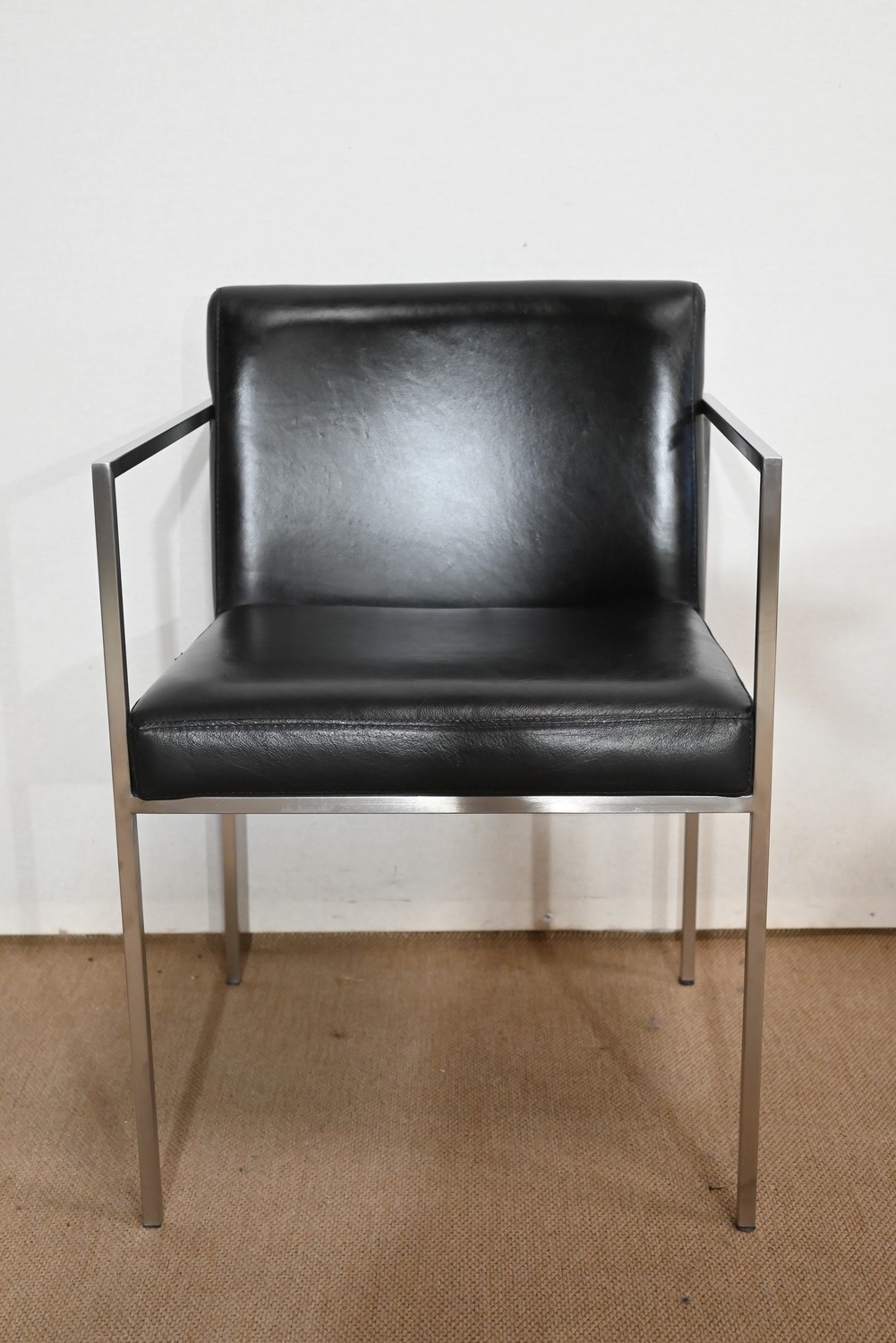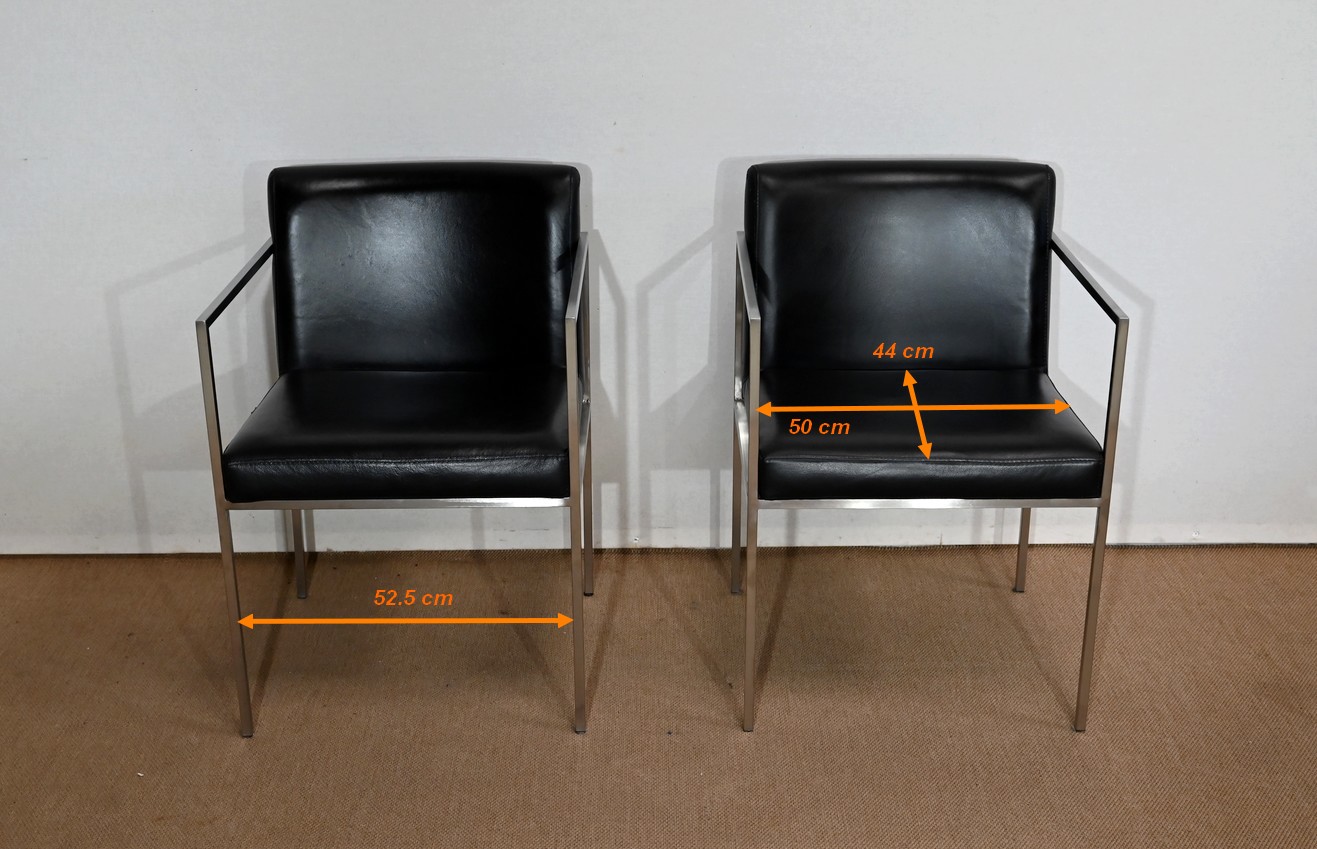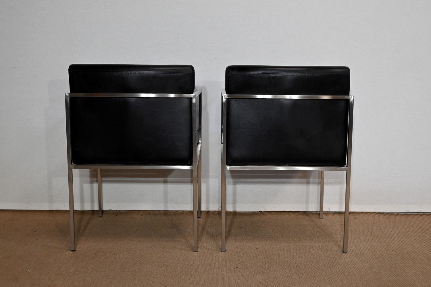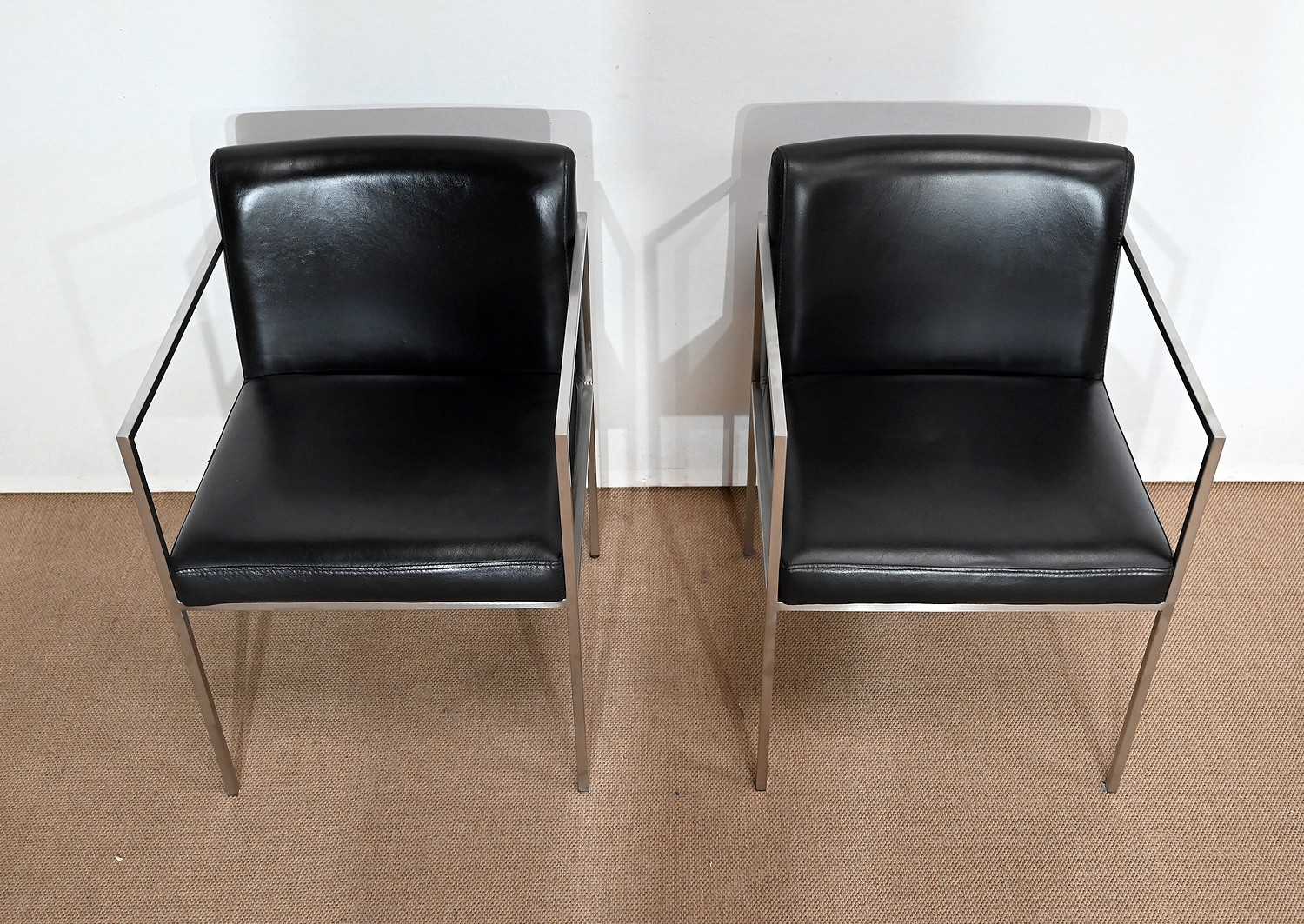 Cette paire de fauteuils, au dossier et à l’assise rectangulaires, en simili cuir noir à piqûres, possède une ossature en métal brossé. Celle-ci, légère et aérienne, aussi bien dans la partie supérieure que dans le piètement, confère une simplicité, qui leur permet de s’inviter dans n’importe quel intérieur.