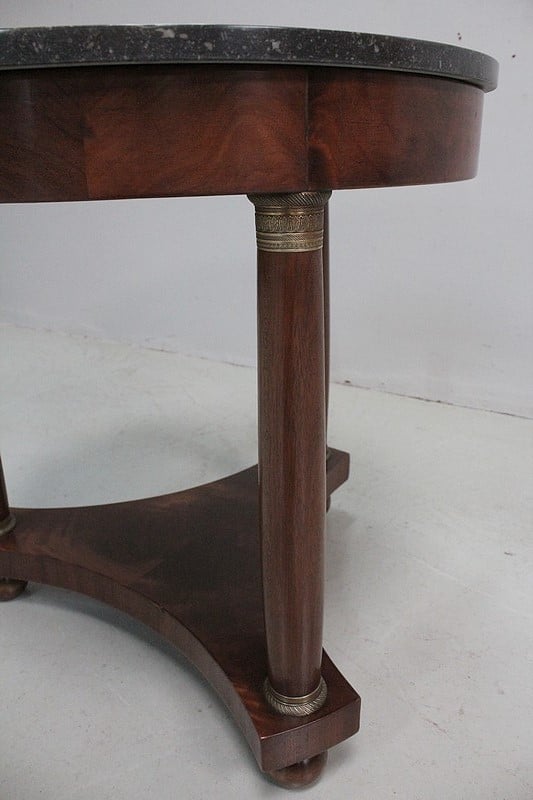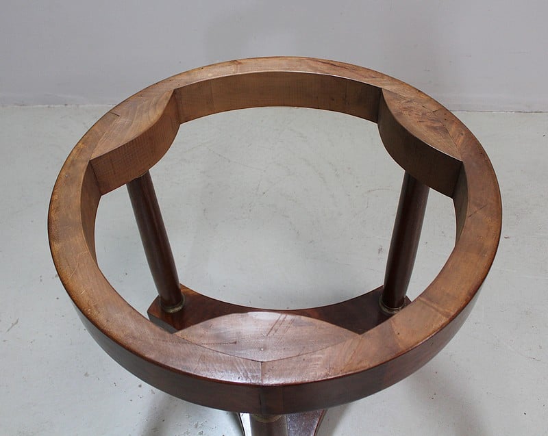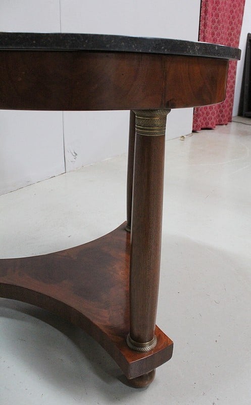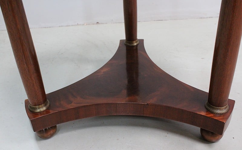 Guéridon Empire en acajou massif et placage d’acajou, reposant sur 3 colonnes posées sur une entretoise à flancs concaves.