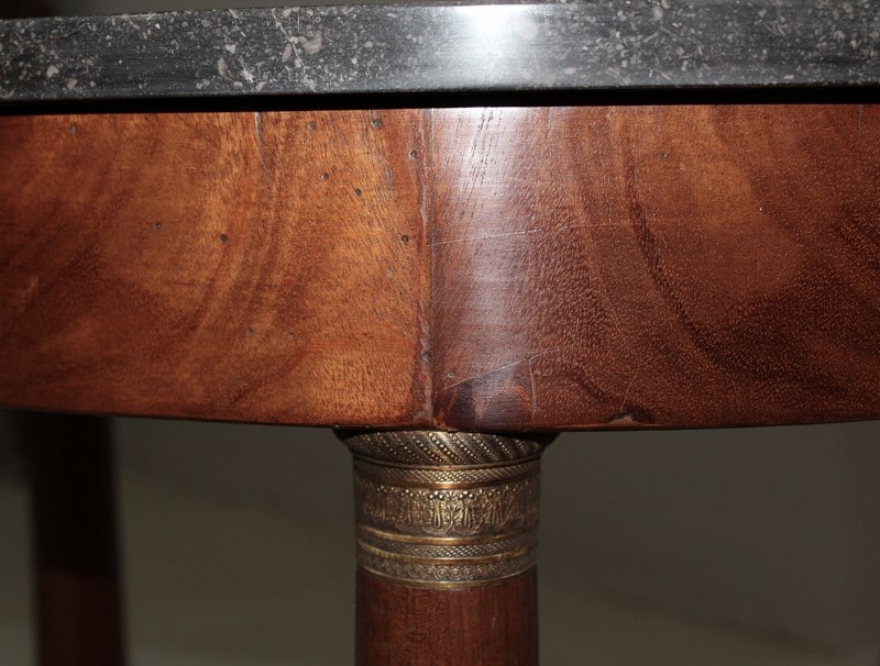 Dessus de marbre granité noir et colonnes cerclées haut et bas de bagues de bronze.