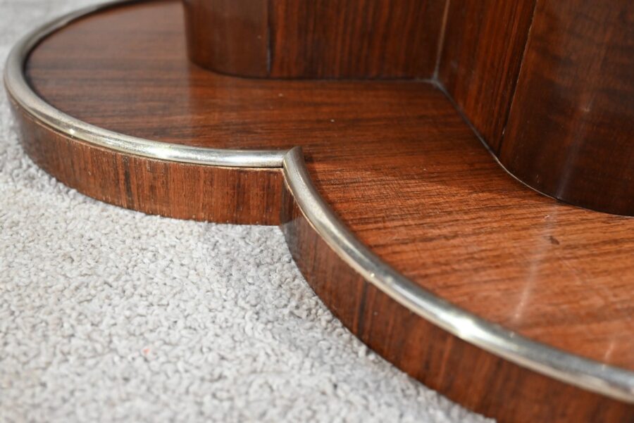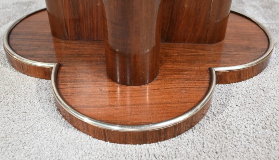 L’ensemble repose sur un socle, en forme de trèfle à quatre feuilles, serti d’un jonc en métal chromé.