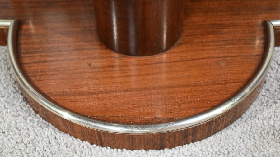 Ce guéridon de forme circulaire présente une ceinture en placage vertical.