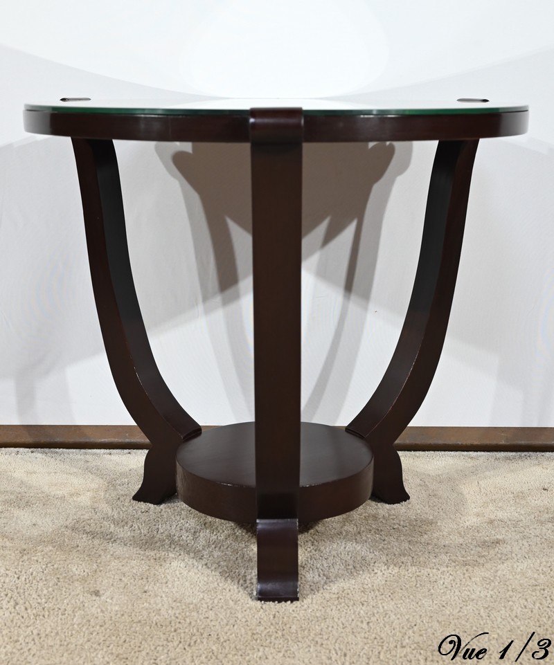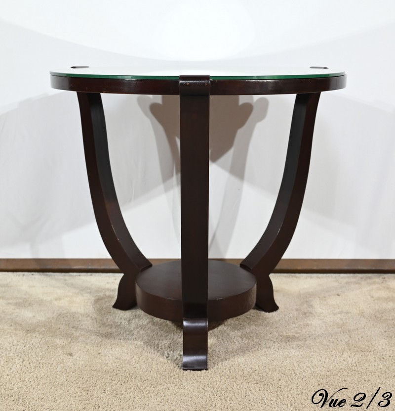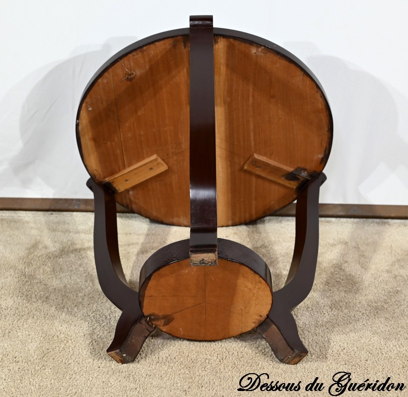Ce guéridon circulaire, en acajou foncé, présente un dessus bois avec plateau miroir.