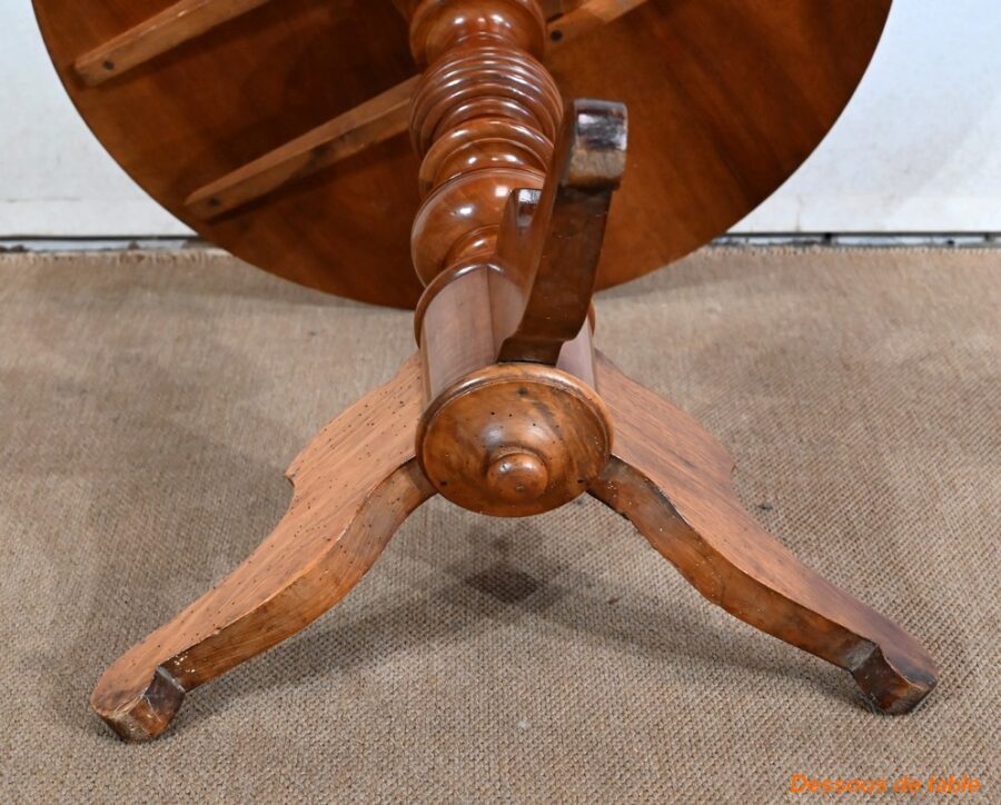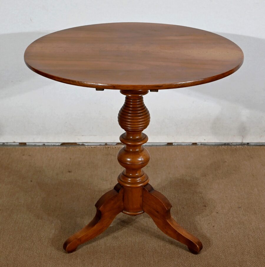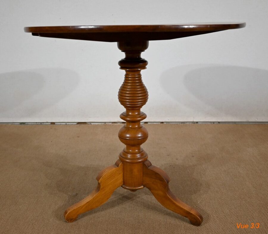 Ce guéridon rond est entièrement en noyer massif. Le fut tourné simple est à anneaux et repose sur trois pieds découpés à empattement.