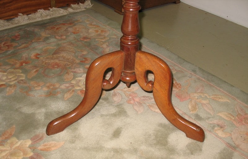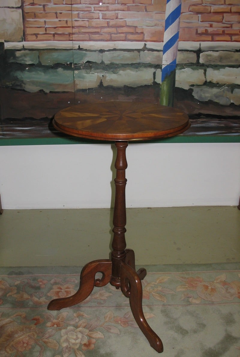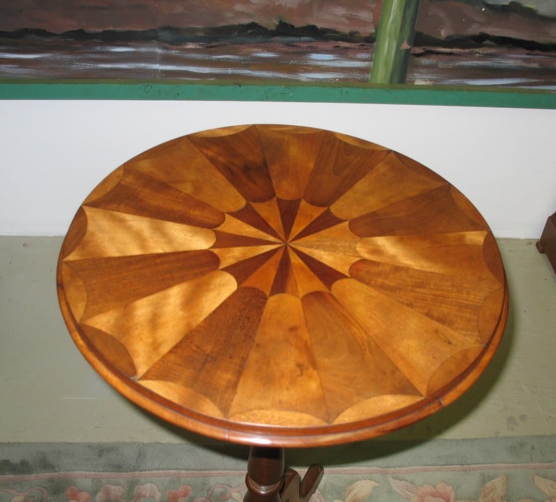 Petit Guéridon, plateau en marqueterie de citronnier et d’acajou, reposant sur un pied tripode. Fin XIXe
