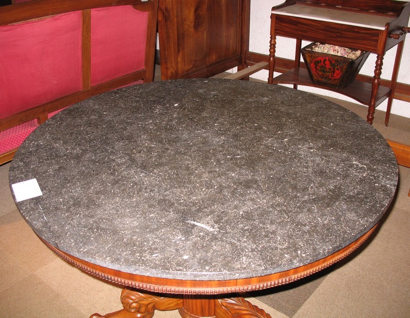 Très beau Guéridon Restauration en Acajou avec dessus marbre noir d’origine. Pied tripode se terminant en griffes de lion, reposant sur roulettes.