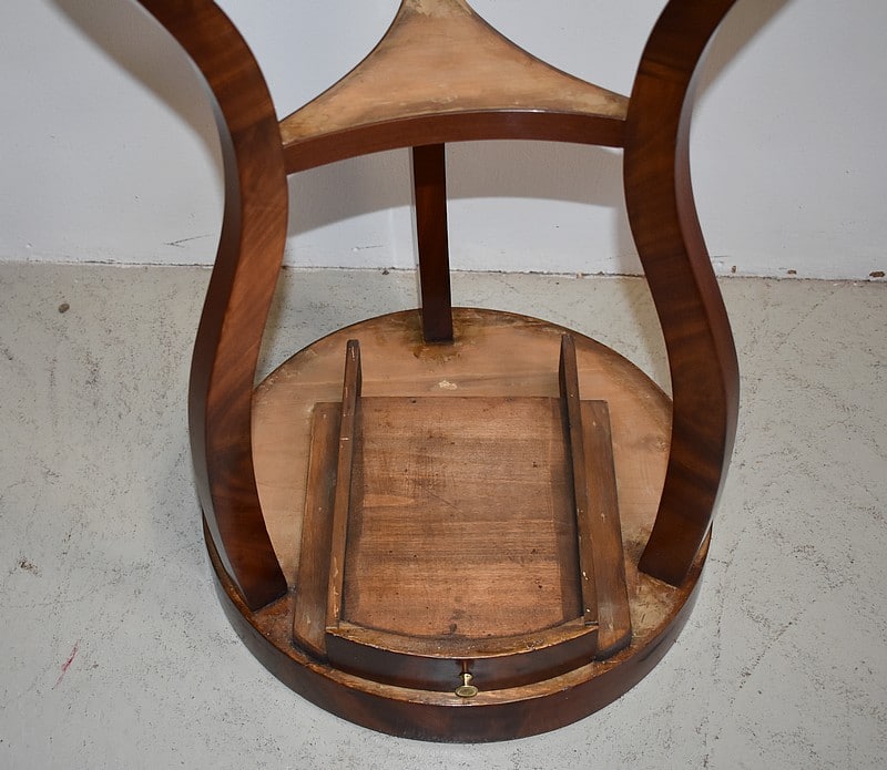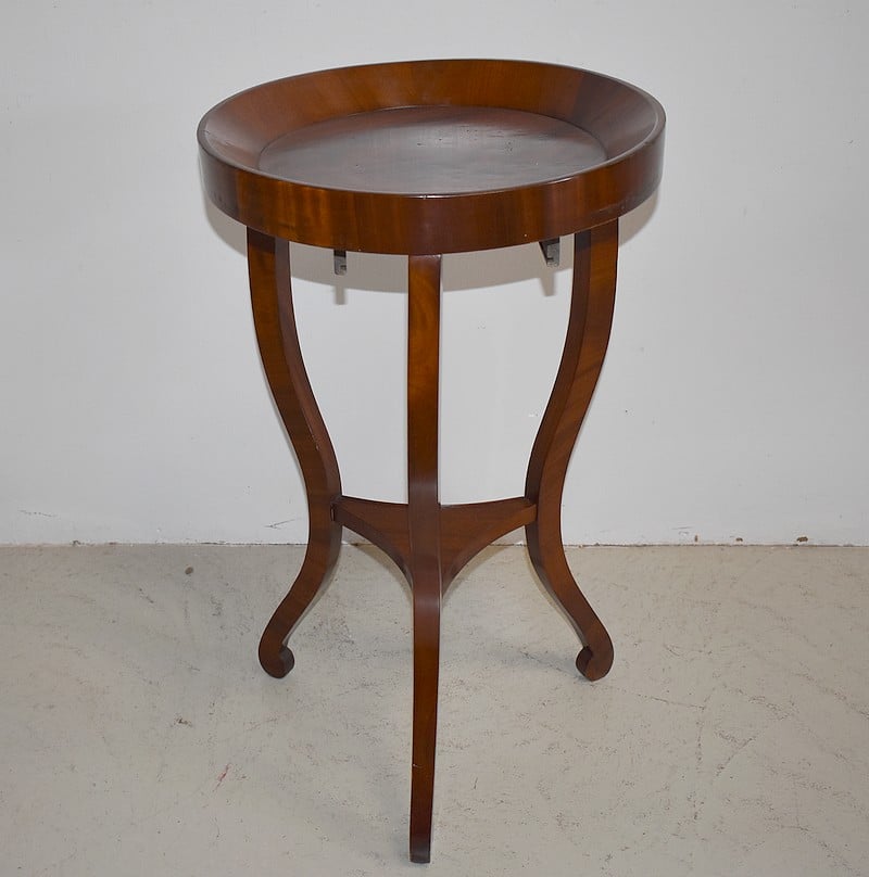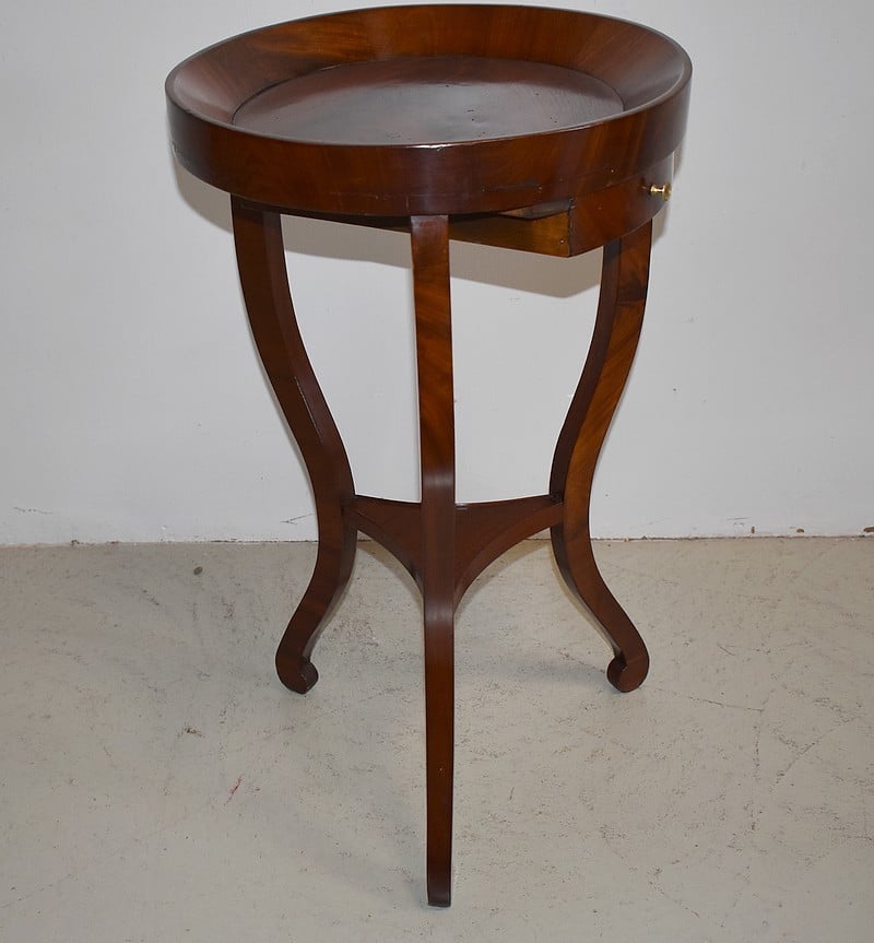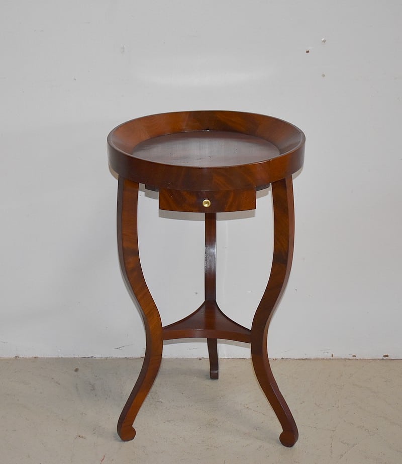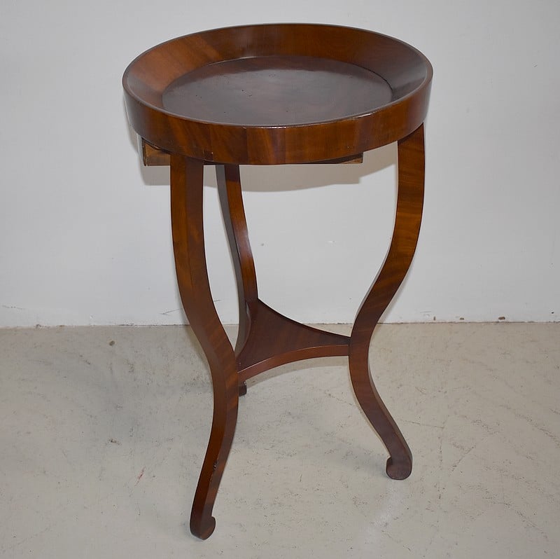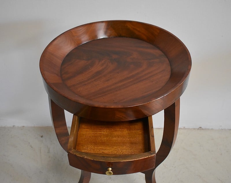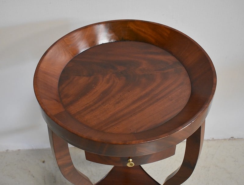 Petit guéridon Restauration en placage d’acajou, dessus en cuvette, reposant sur 3 pieds galbés réunis par une petite entretoise.