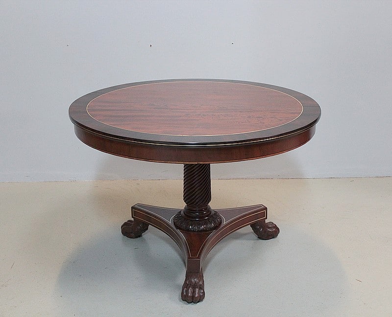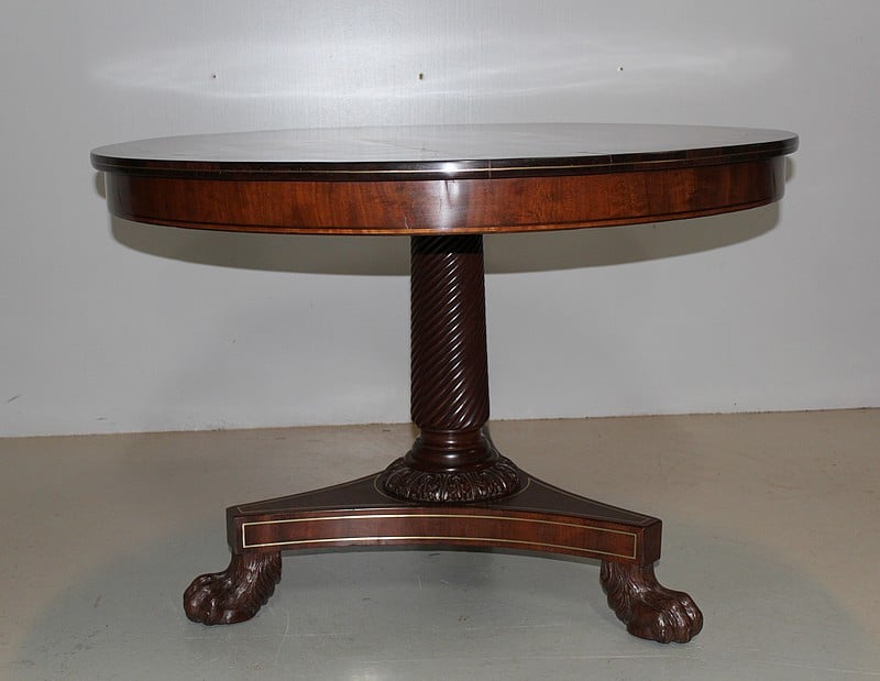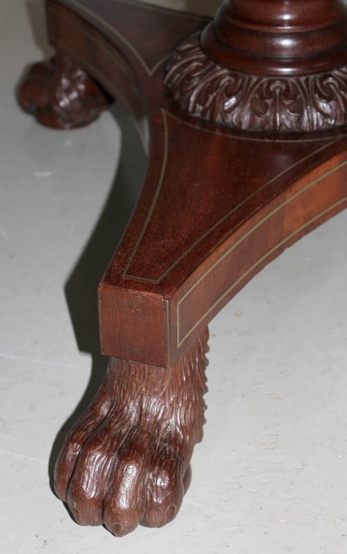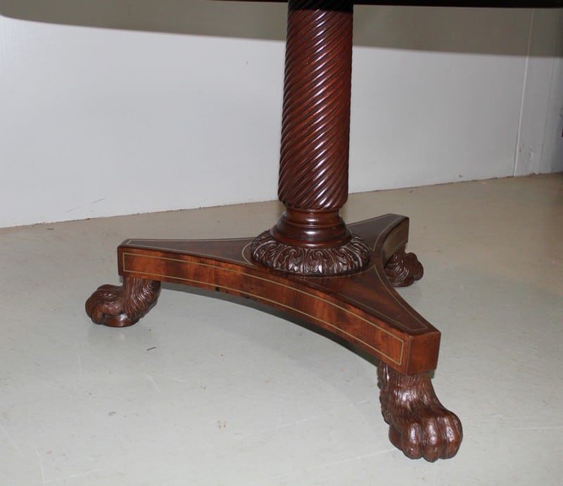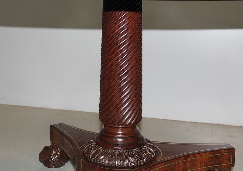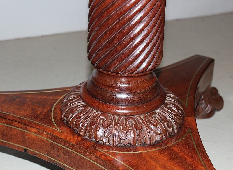 Le fût central, en acajou massif, à fines torsades et socle sculpté de feuilles d’acanthe repose sur un piètement tripode aux extrémités en griffes de lion également en acajou massif.