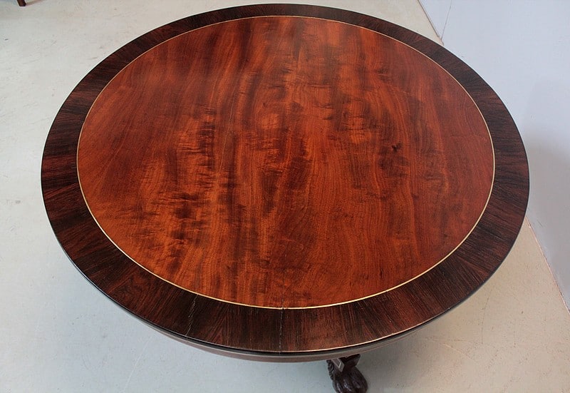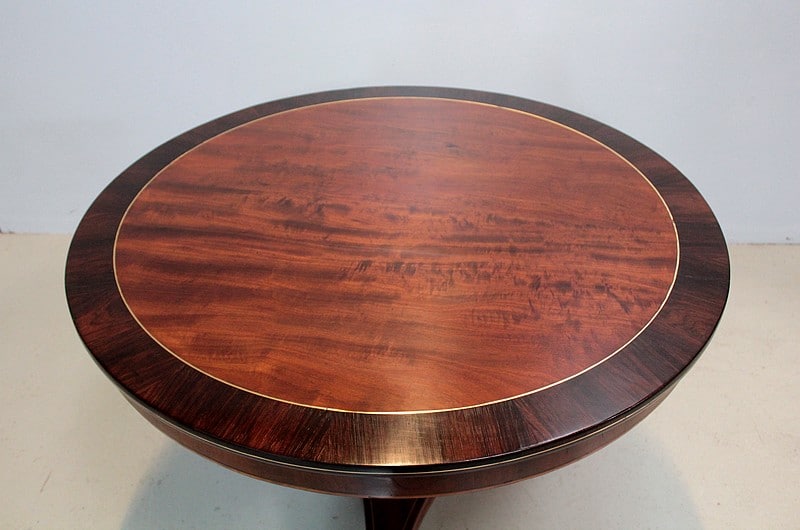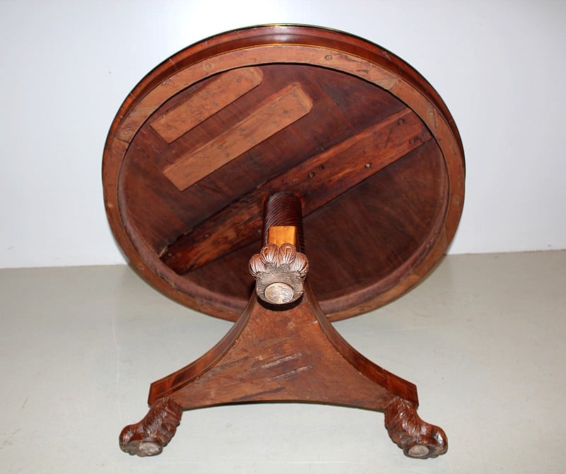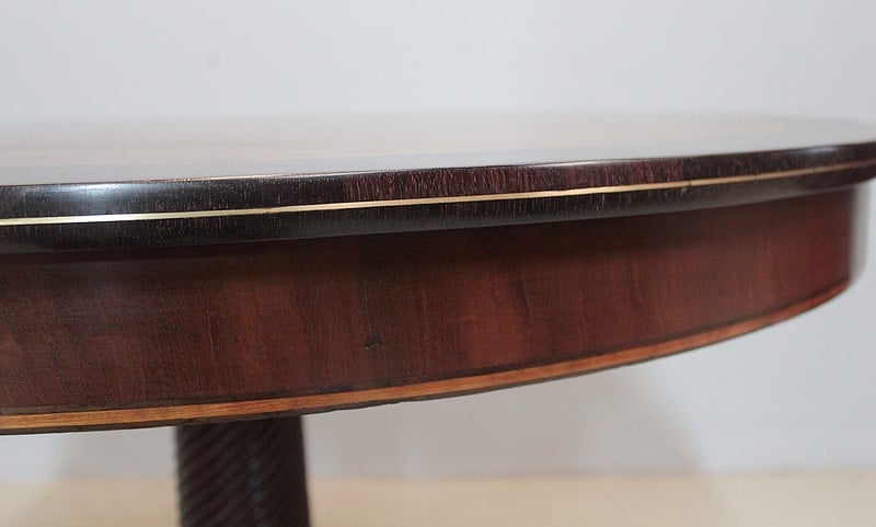 Guéridon Restauration en placage d’ acajou et de palissandre avec filet de laiton sur le dessus et sur le champ.
