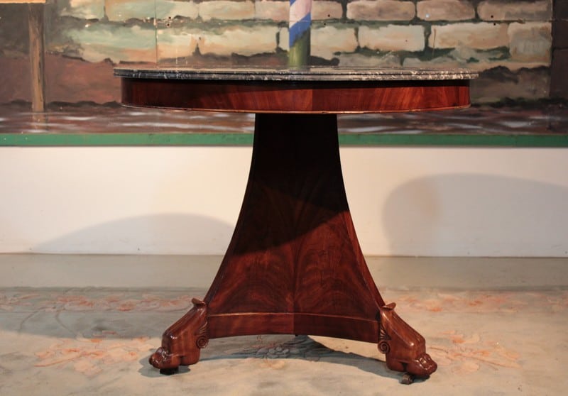 Guéridon Restauration en placage de ronce d’acajou à ceinture. Dessus en marbre gris Ste Anne à gorge en parfait état d’origine (ni fêle, ni rayure).