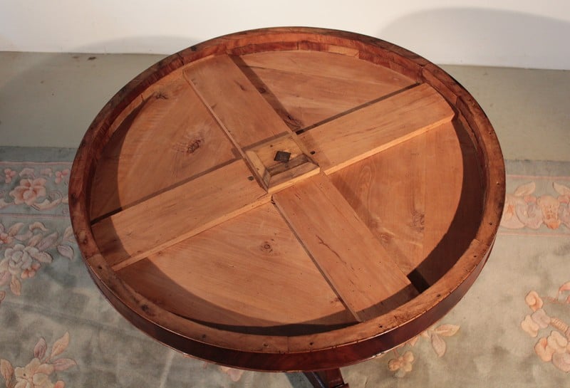 Il repose sur un fût pyramidal posé sur 3 pieds en griffes de lion massifs sur roulettes. Époque : début XIXe (1820).
