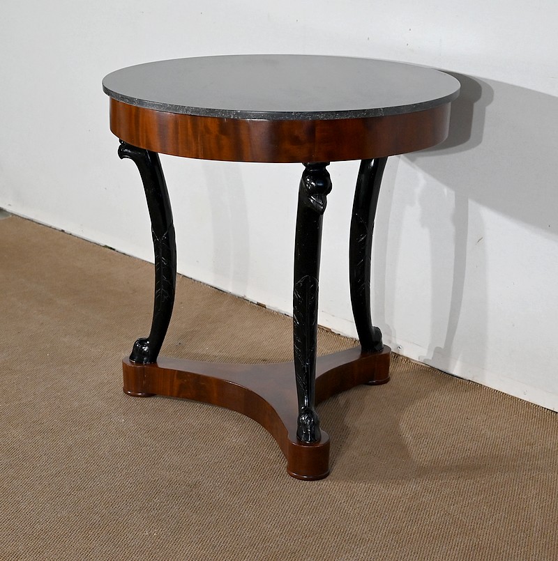Guéridon circulaire Retour d’Égypte dont la ceinture est en placage d’acajou en fil tombant, surmonté d’un marbre granité belge.