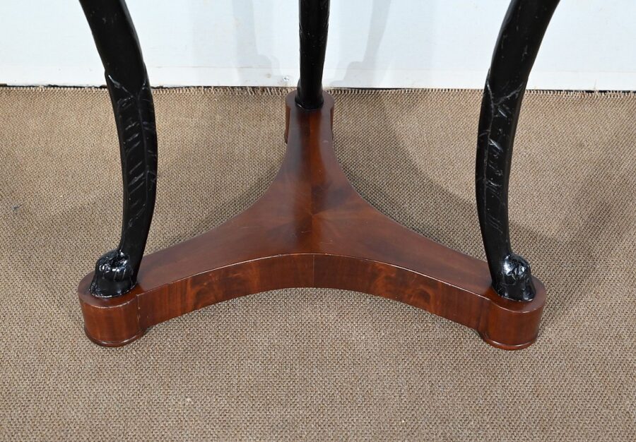 Cette petite table repose sur trois pieds en vernis noir. Ceux-ci sont sculptés en forme d’Horus élancés. Ils reposent sur une base constituée de trois côtés concaves dont le dessus en placage d’acajou est travaillé en étoile.