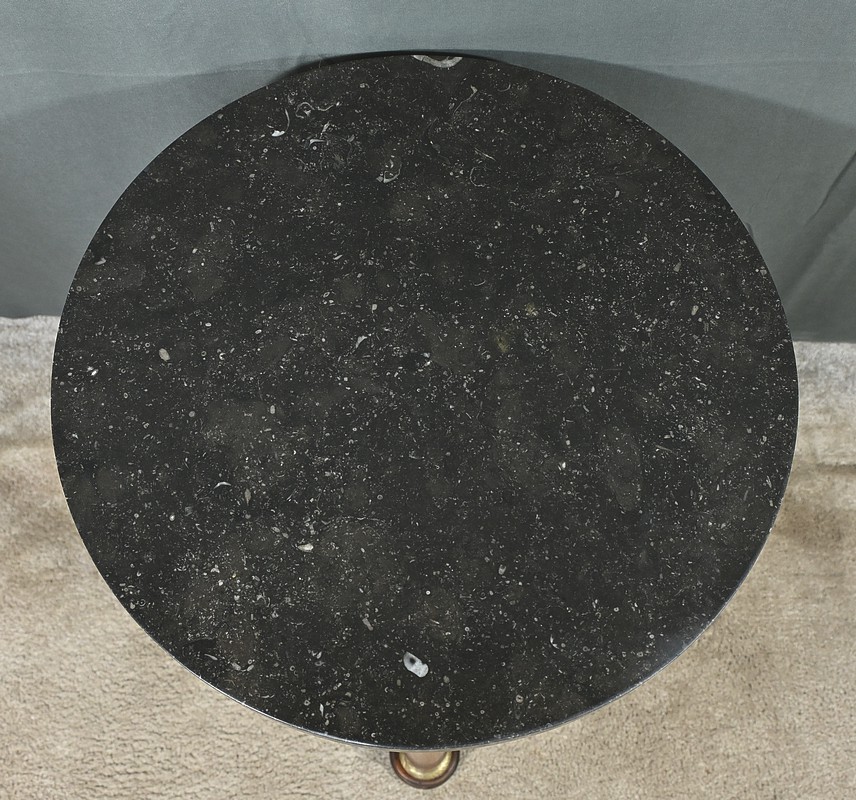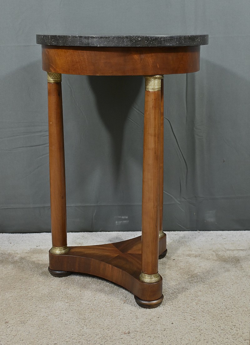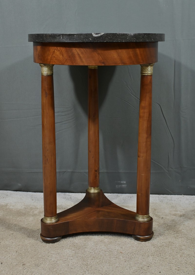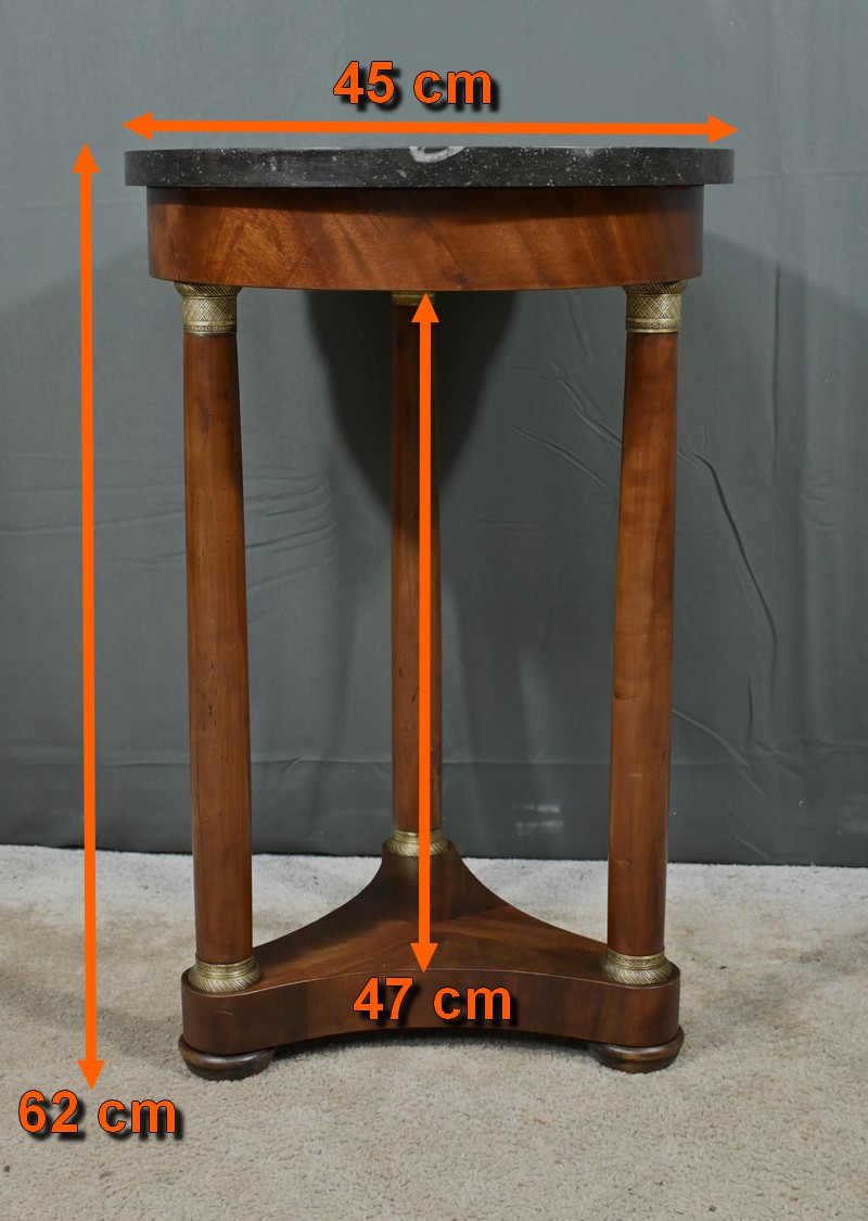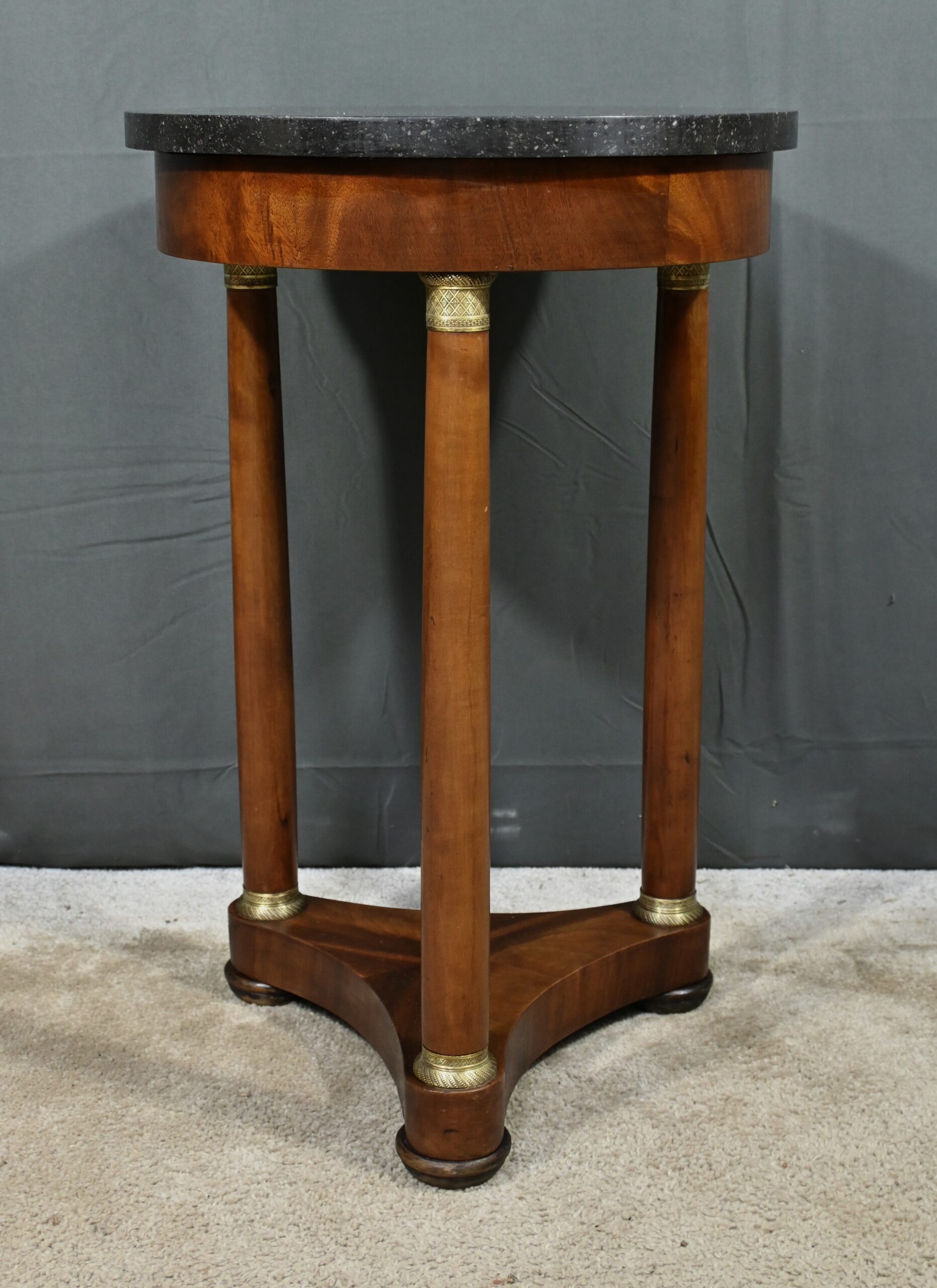 Élégant guéridon en acajou de style Empire de forme circulaire, sommé d’un marbre noir Sainte Anne. La ceinture est soutenue par trois colonnes cylindriques. Elles sont munies de bagues à chapiteau en bronze en partie haute et de collerettes ciselées en partie basse.