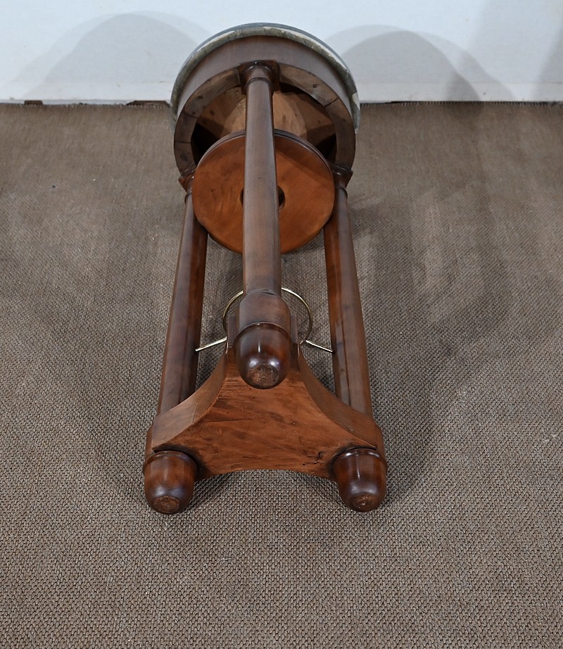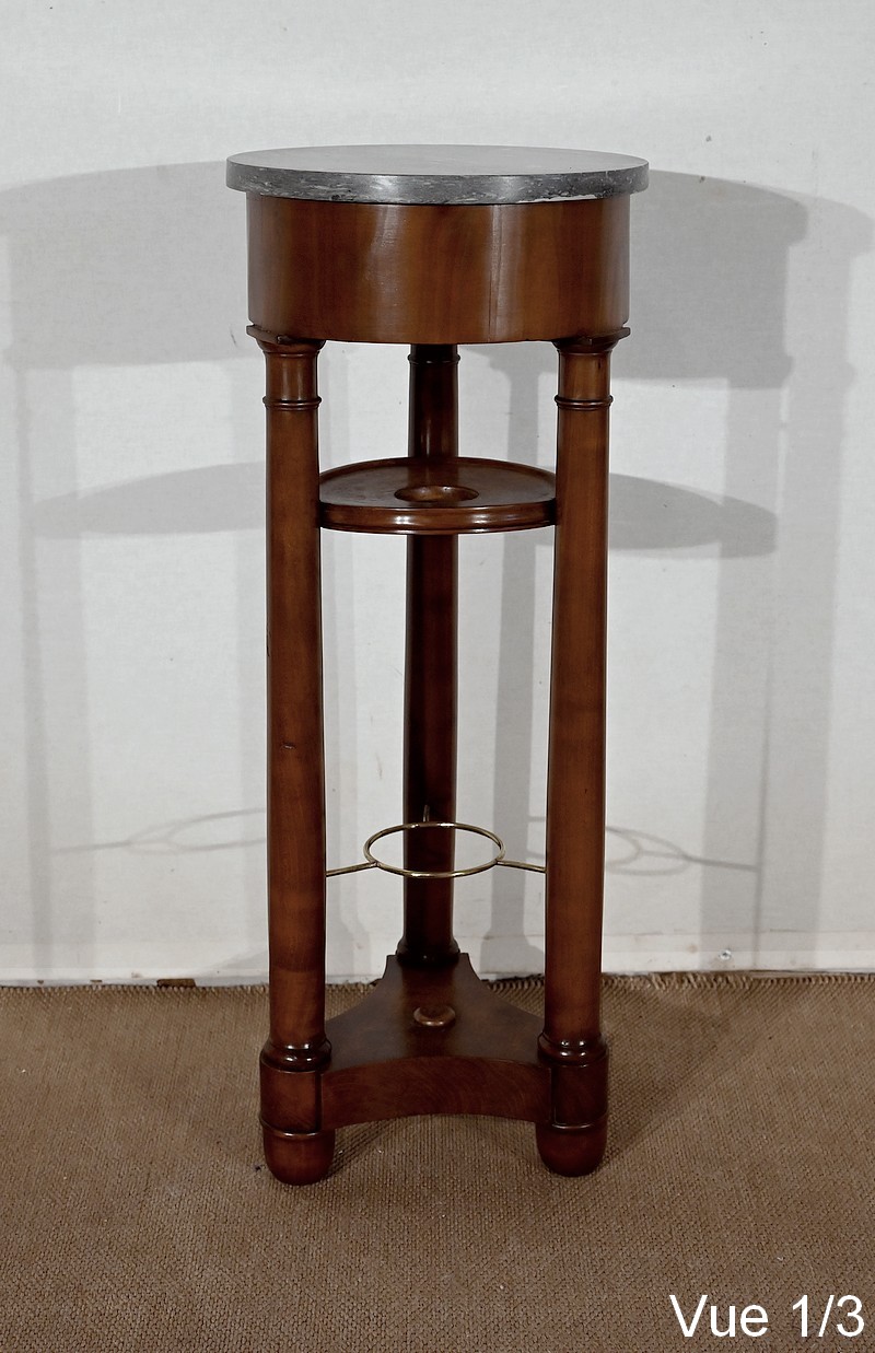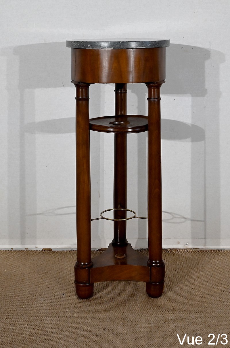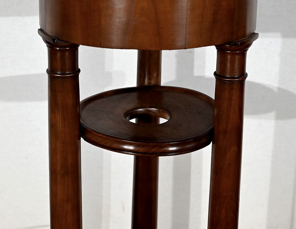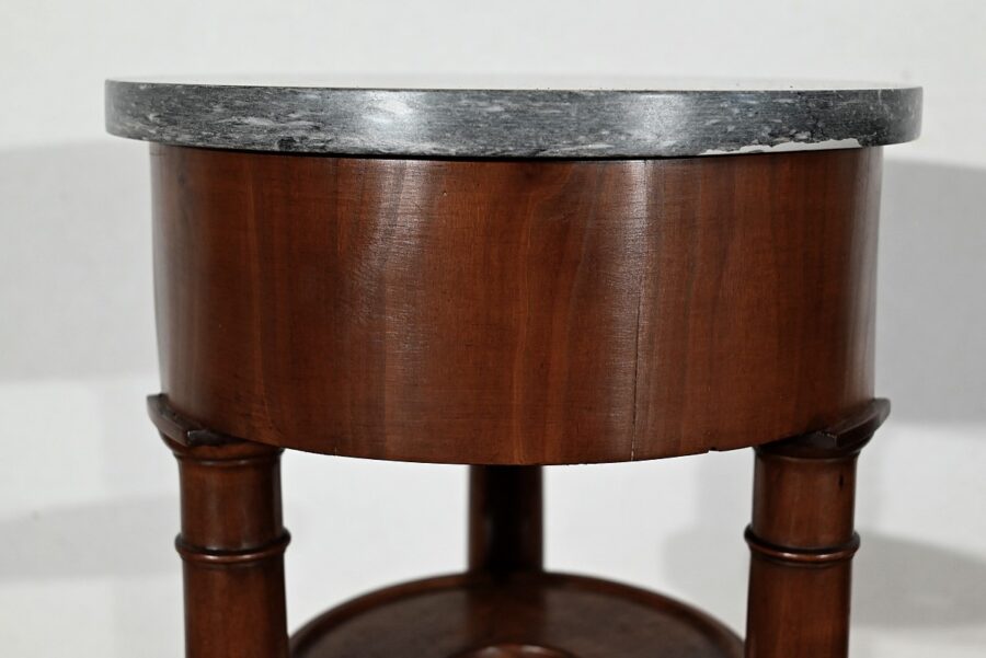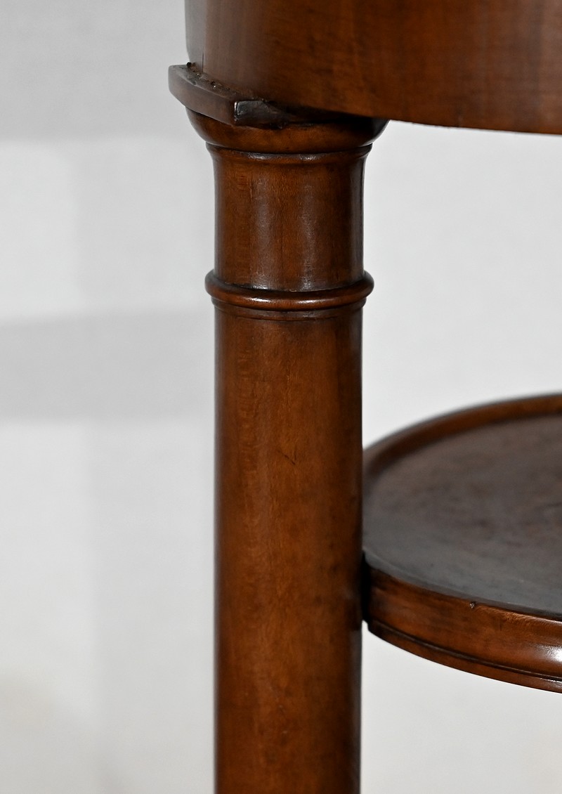 Utilisée durant l’empire comme barbière, cette élégante athénienne, se distingue par la petite dimension de son plateau circulaire et son beau marbre bleu d’Aspin. La ceinture en placage de merisier roux au veinage subtil est soutenue par trois pieds tournés en merisier massif s’affinant vers le haut et munis de collerettes en bois et de chapiteaux. Ceux-ci reposent sur une base en merisier massif aux trois côtés concaves. Enchâssés entre les pieds, nous retrouvons une tablette à cuvette moulurée sur le chant et en partie inférieure, une structure circulaire en laiton attachée par trois tiges.