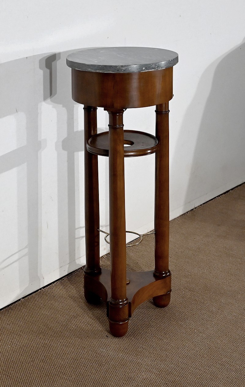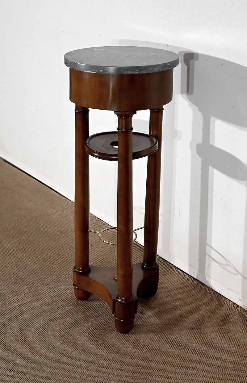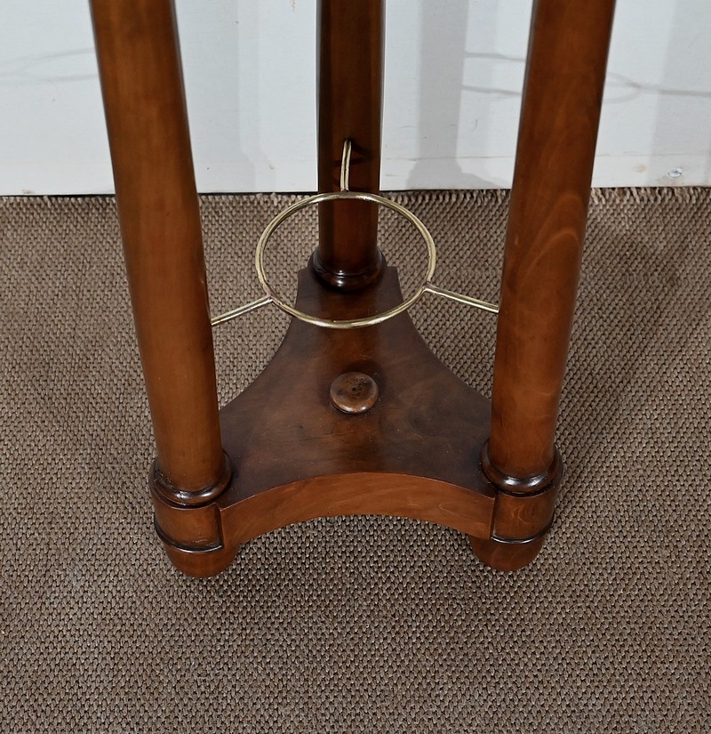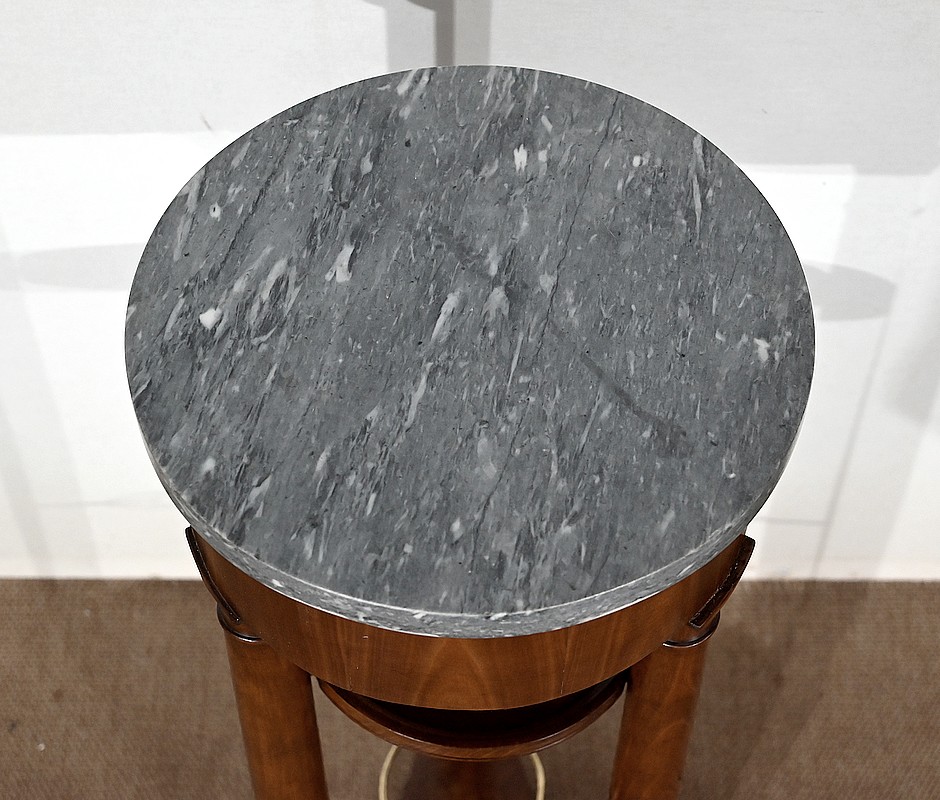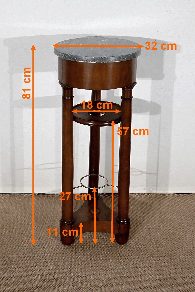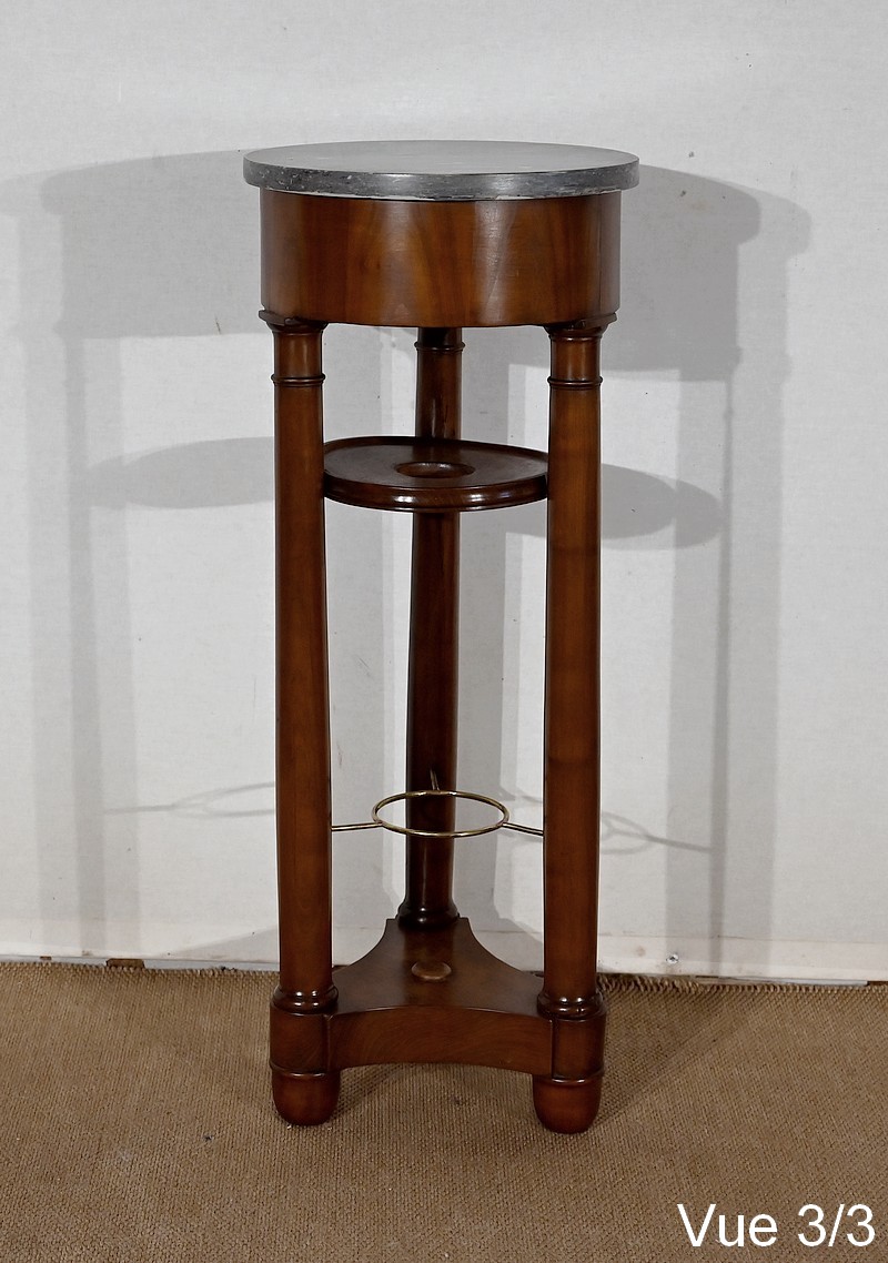 Utilisée durant l’empire comme barbière, cette élégante athénienne, se distingue par la petite dimension de son plateau circulaire et son beau marbre bleu d’Aspin. La ceinture en placage de merisier roux au veinage subtil est soutenue par trois pieds tournés en merisier massif s’affinant vers le haut et munis de collerettes en bois et de chapiteaux. Ceux-ci reposent sur une base en merisier massif aux trois côtés concaves. Enchâssés entre les pieds, nous retrouvons une tablette à cuvette moulurée sur le chant et en partie inférieure, une structure circulaire en laiton attachée par trois tiges.