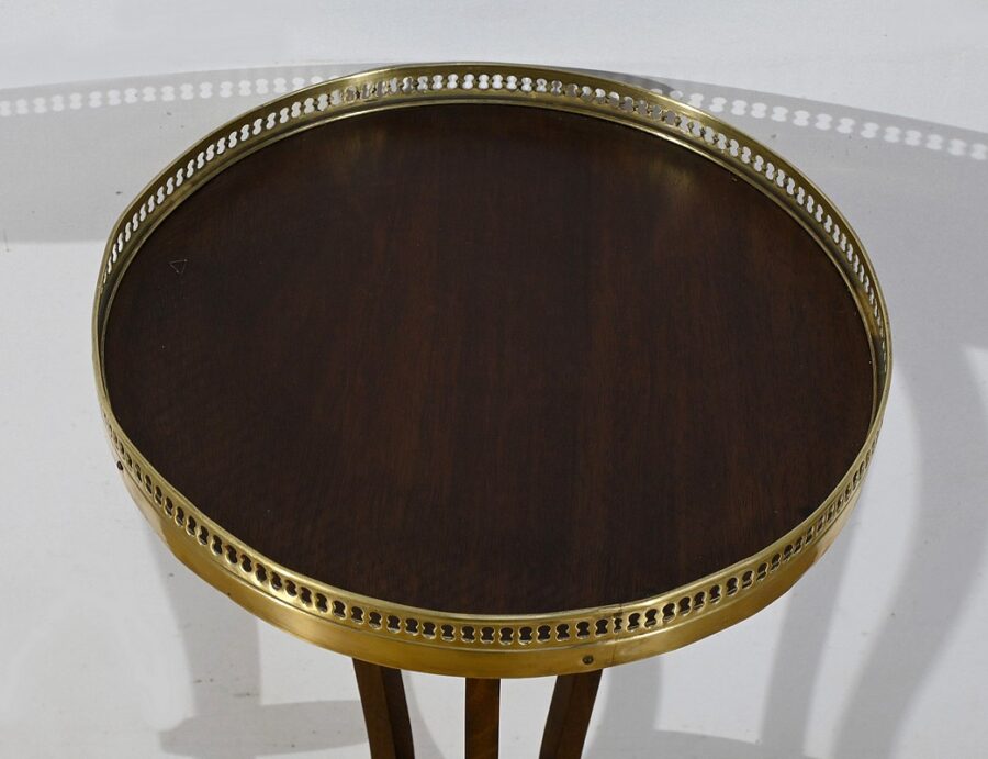 Charmant guéridon en acajou de style Louis XVI, dont le plateau est ceinturé d’une galerie ajourée en laiton. Le piétement tripode est composé de trois pieds évasés reliés à une tablette d’entrejambes circulaire également. Un petit mobilier élégant aux dimensions idéales pour les petits espaces.