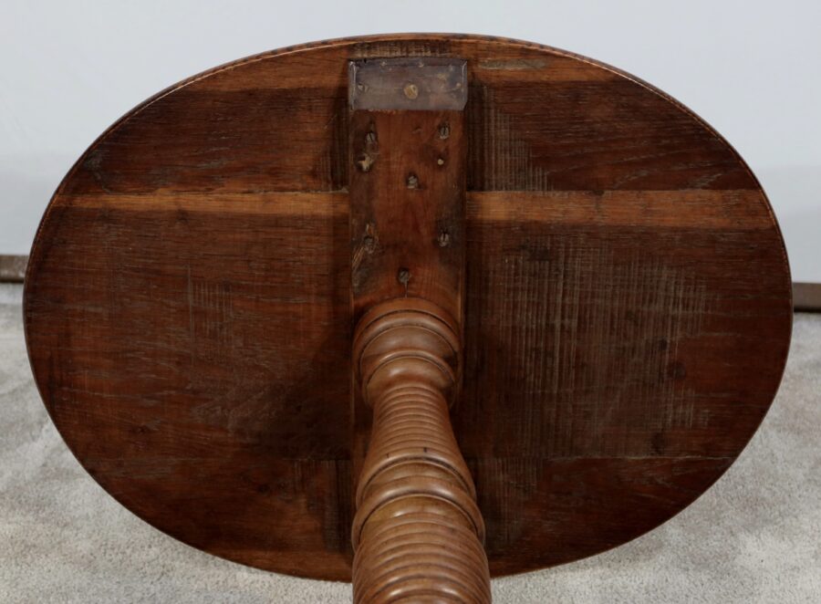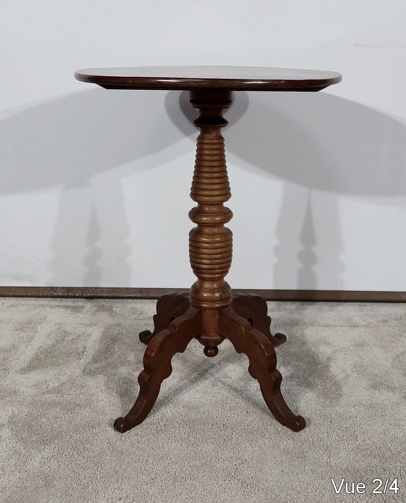 Cette petite table vous charmera par son fût tourné en chapelet se terminant par quatre pieds bas mouvementés en volute. Ces quatre pieds évasés à découpe apportent caractère à ce meuble datant du XIXe siècle.