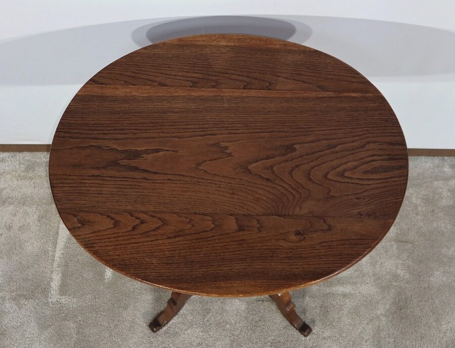 Charmant guéridon de forme oblongue constitué d’un dessus en chêne massif et d’un piétement en noyer.