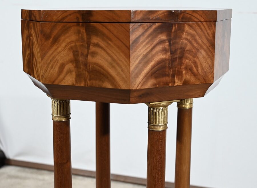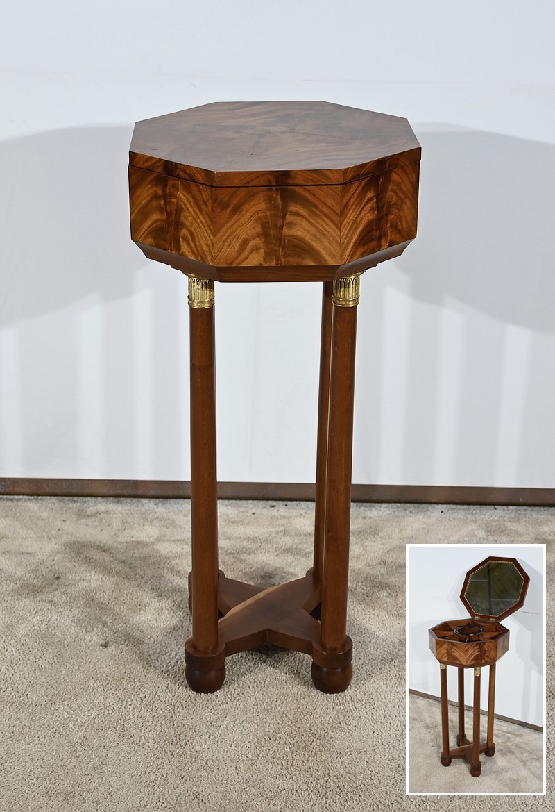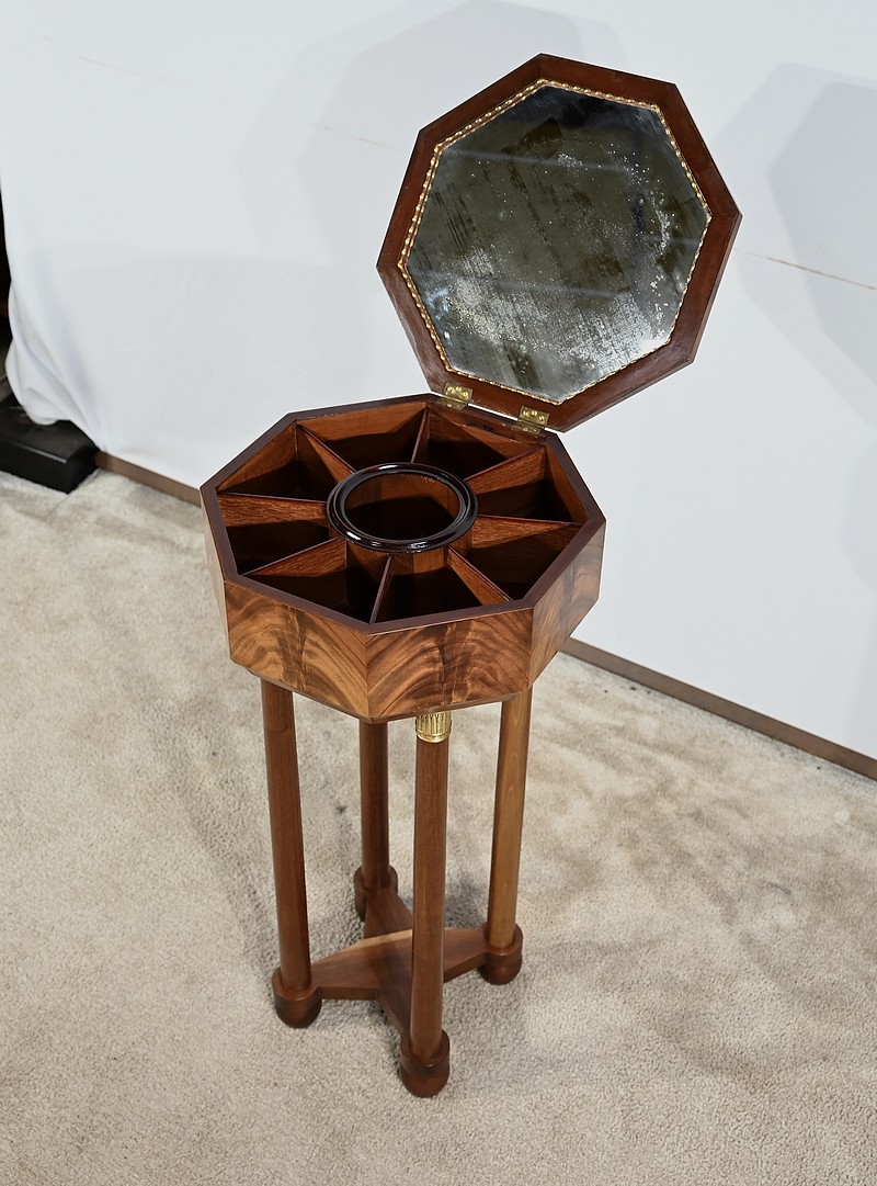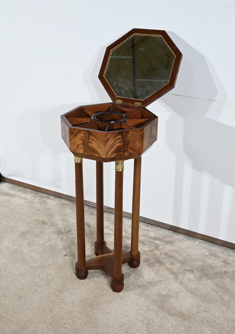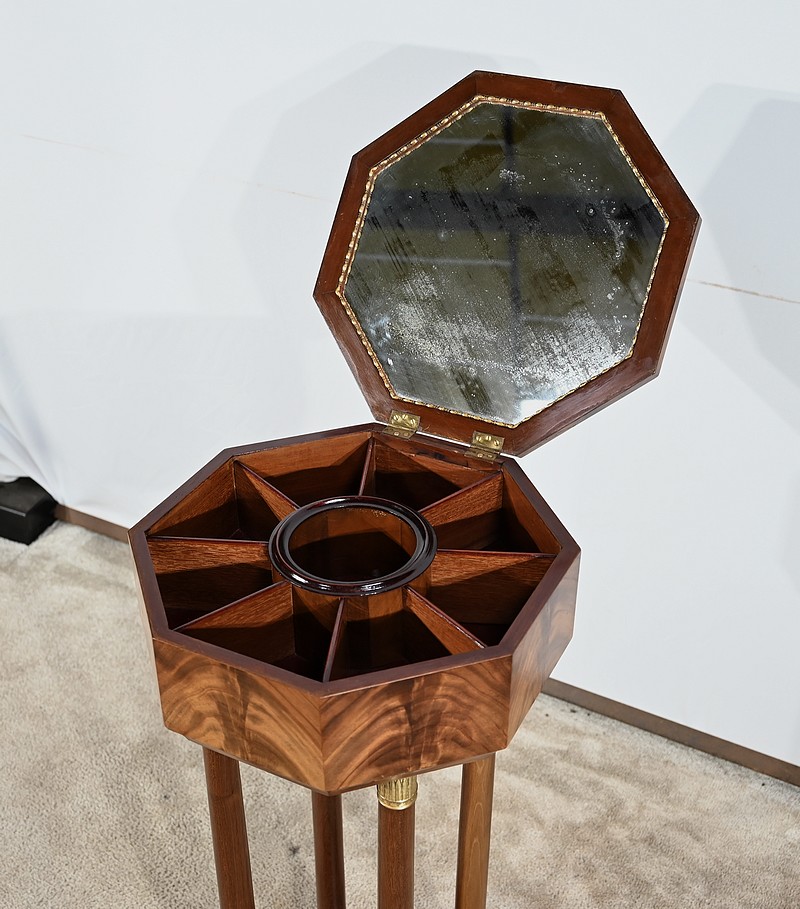 Charmant petit meuble de forme octogonale en placage d’acajou, disposé en ailes de papillon sur le dessus. A l’ouverture, nous découvrons un miroir au mercure, d’origine et octogonal, entouré de baguettes en bronze façonné.