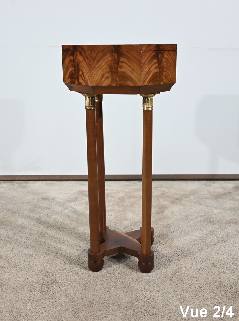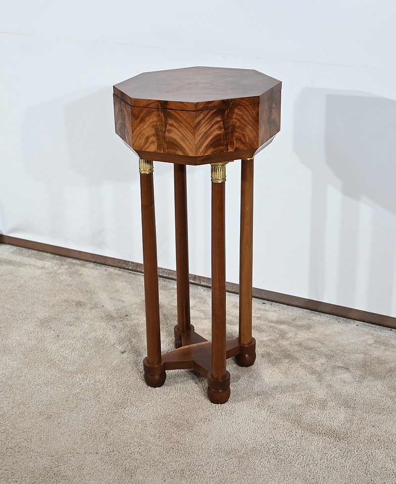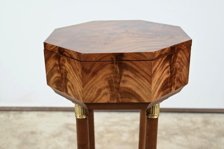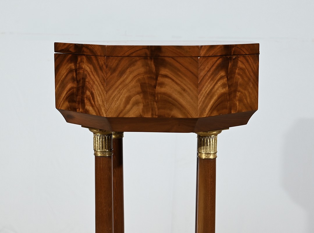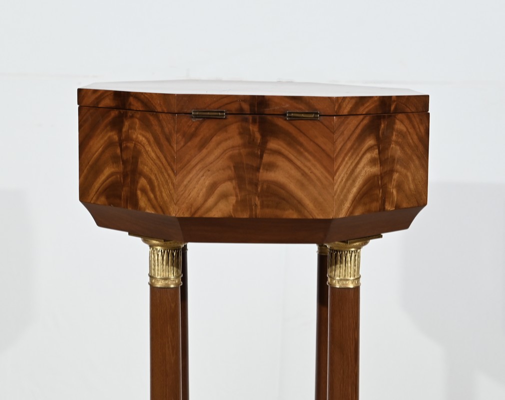 Charmant petit meuble de forme octogonale en placage d’acajou, disposé en ailes de papillon sur le dessus. A l’ouverture, nous découvrons un miroir au mercure, d’origine et octogonal, entouré de baguettes en bronze façonné.