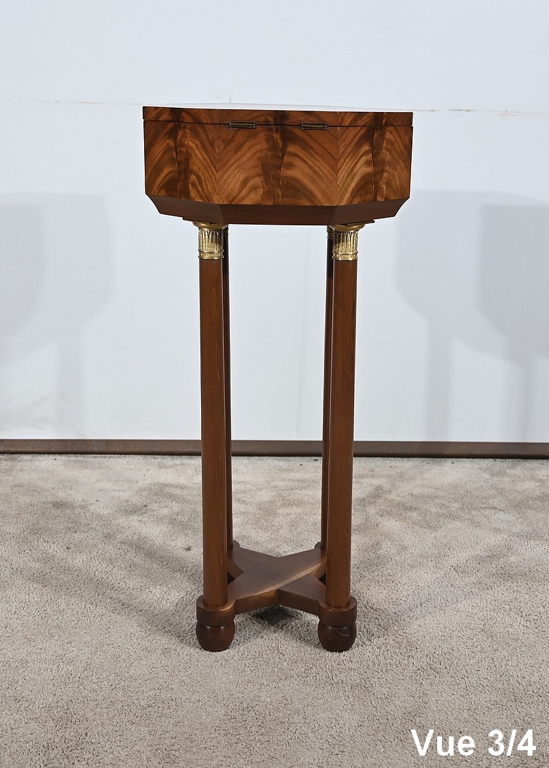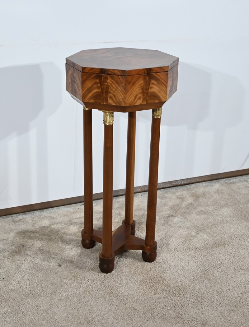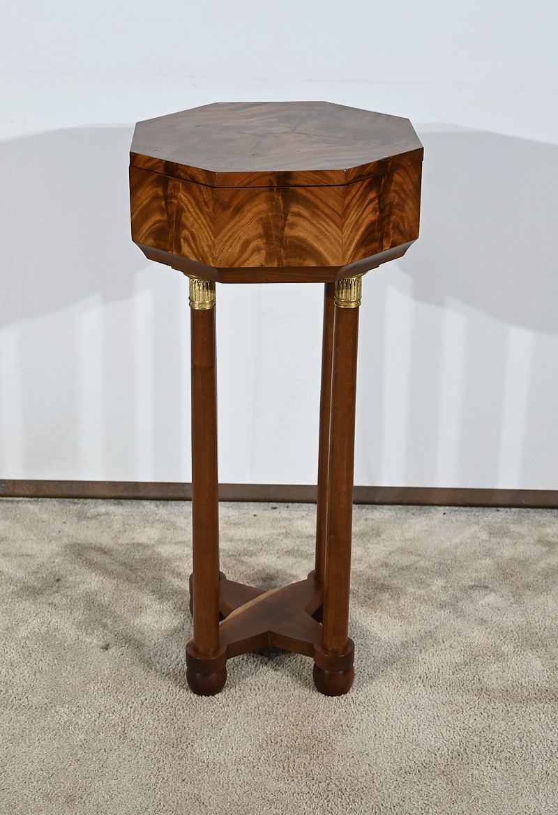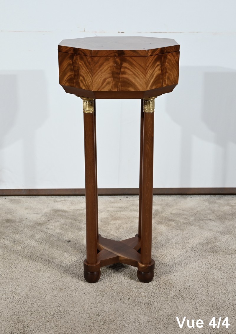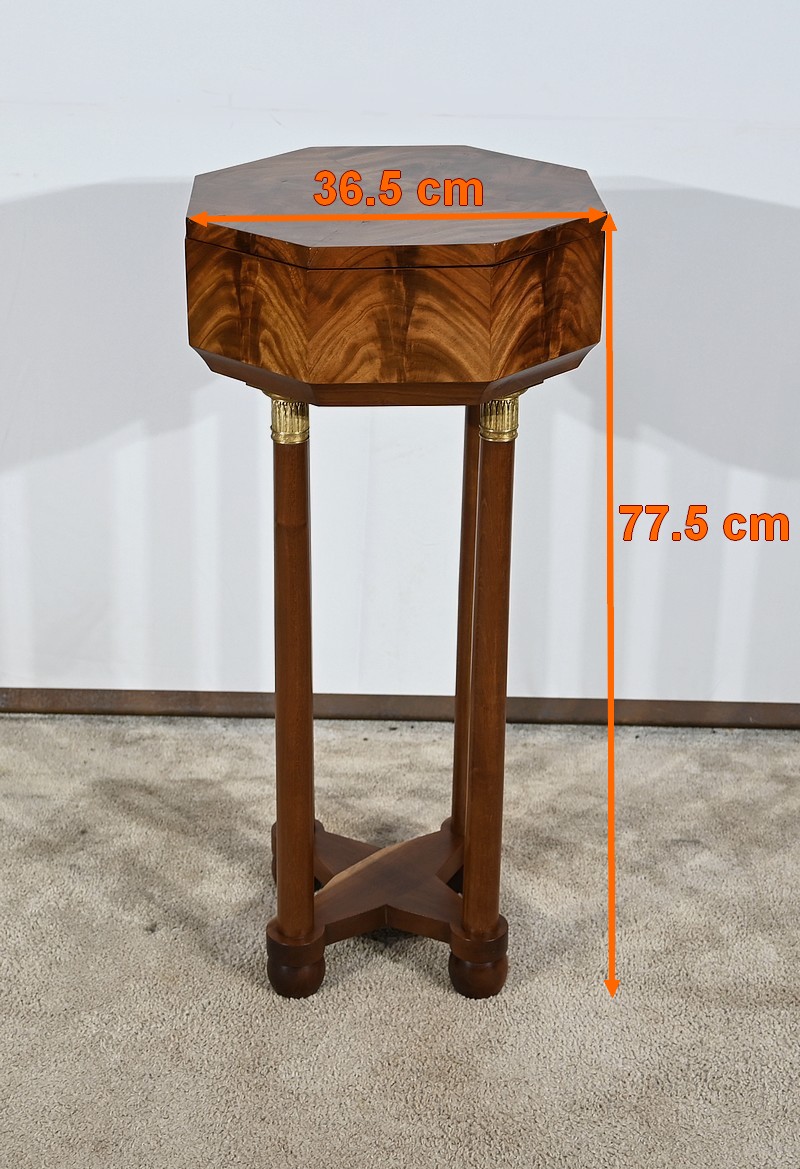 Charmant petit meuble de forme octogonale en placage d’acajou, disposé en ailes de papillon sur le dessus. A l’ouverture, nous découvrons un miroir au mercure, d’origine et octogonal, entouré de baguettes en bronze façonné.