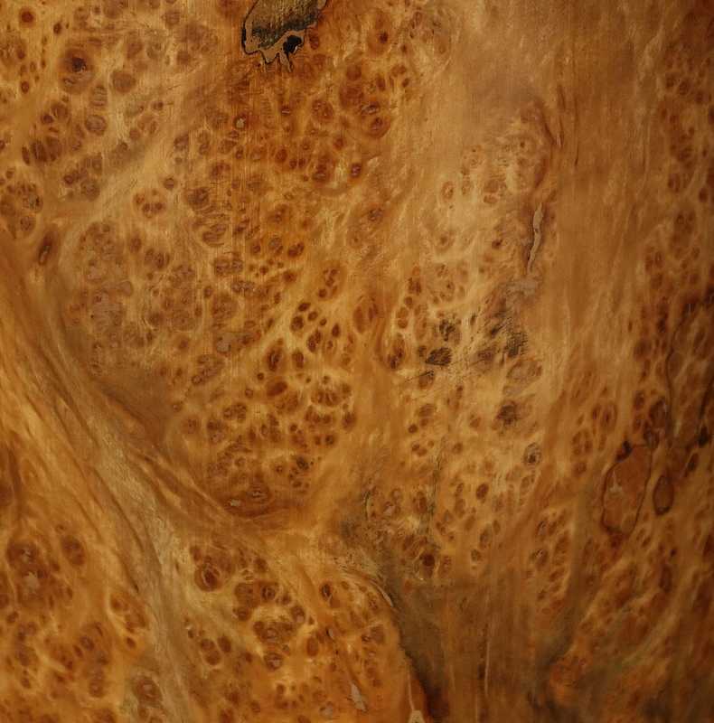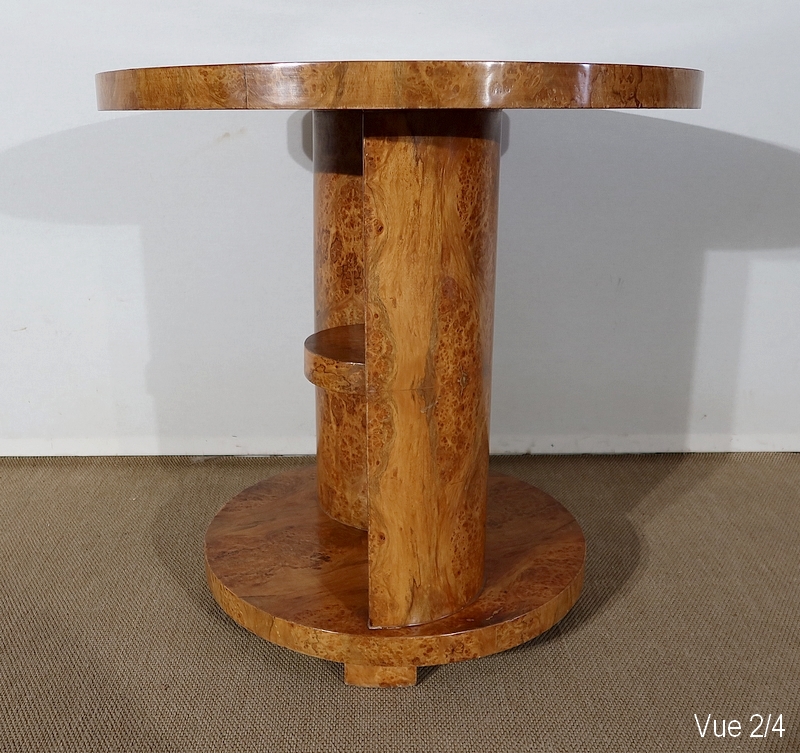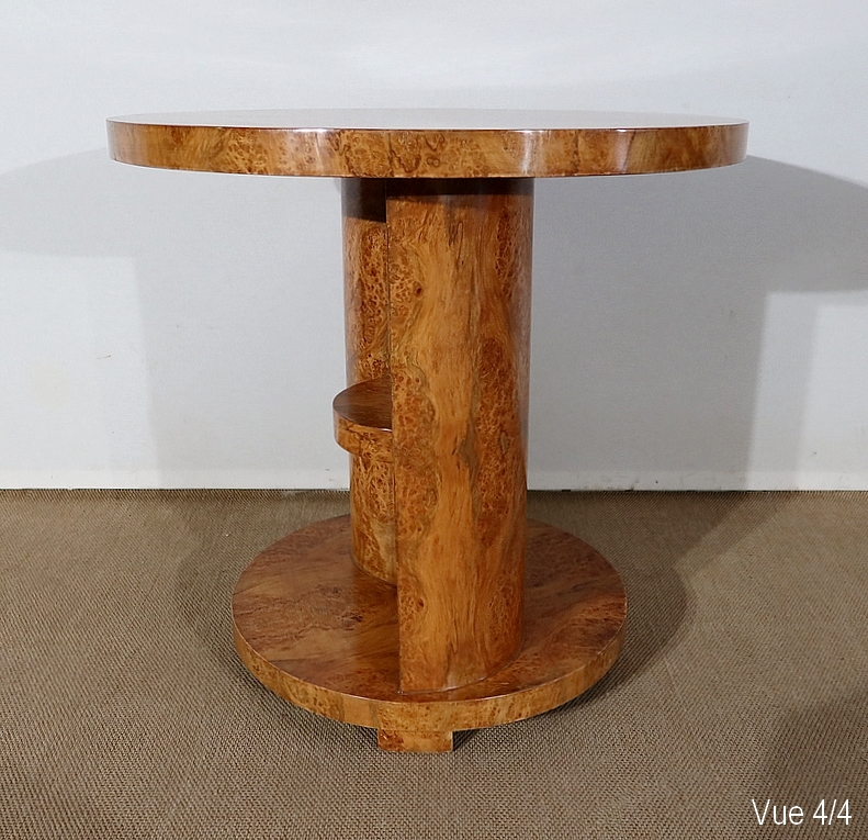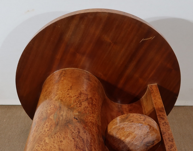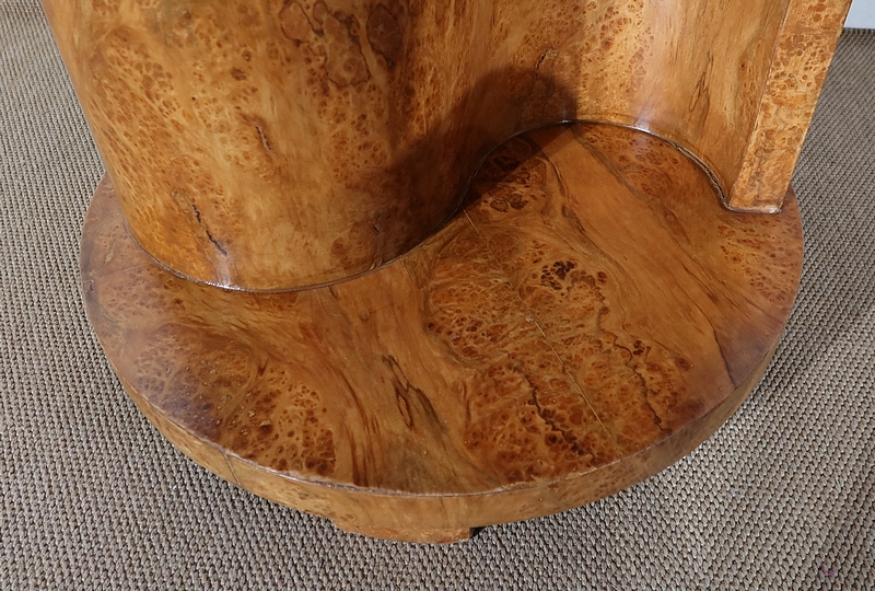 Beau guéridon en Loupe de thuya dans le style modernisme, muni d’un dessus circulaire composé d’un 4 feuilles en placage de Thuya. Cet ensemble symétrique laisse apparaitre au centre un motif de cœur de thuya légèrement plus sombre.