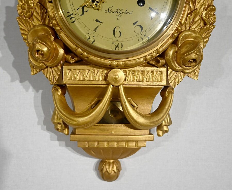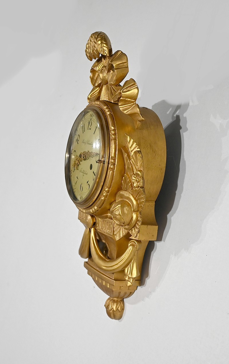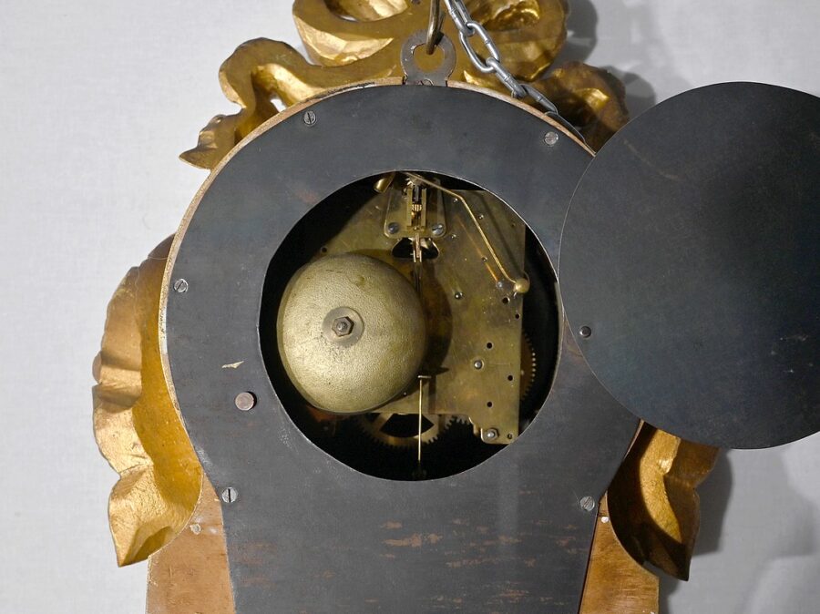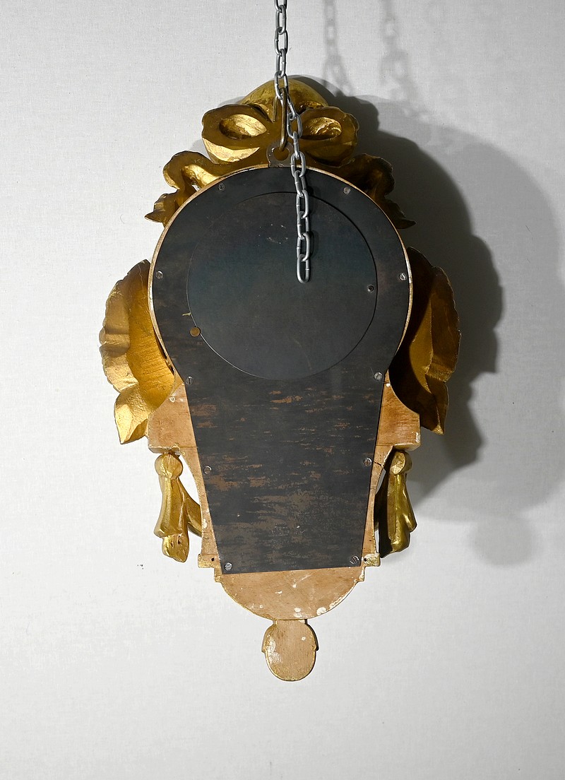 Cartel mural en bois sculpté et doré, à décor de floral, agrémenté au sommet d’un bouquet de feuillages retenu par un large nœud Louis XVI. Sur les côtés, des roses sont surmontées de feuilles ciselées, et en partie basse, un socle est accompagné de drapés élégants.