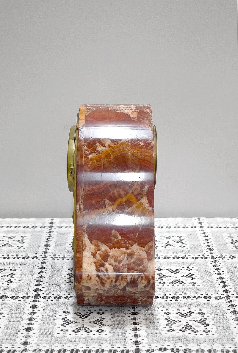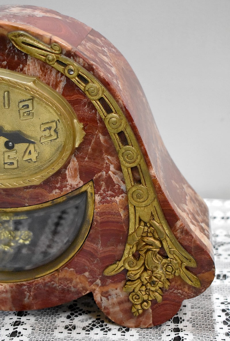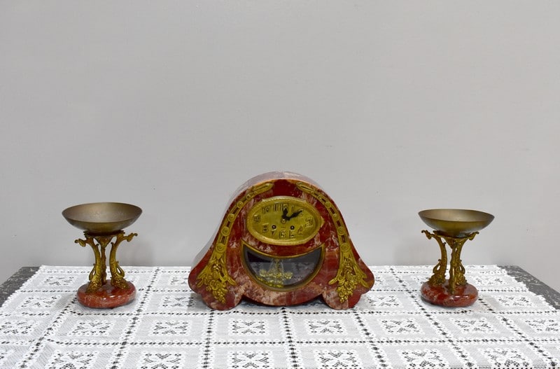 Ensemble de cheminée Art Déco dont la pendule est en marbre rouge du Languedoc, découpé et sculpté. L’ensemble est également composé de deux vide-poches flanqués de chaque côté de la pendule.