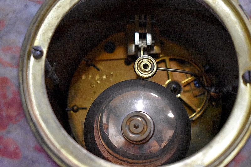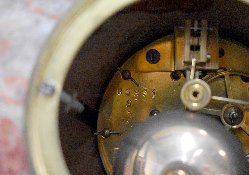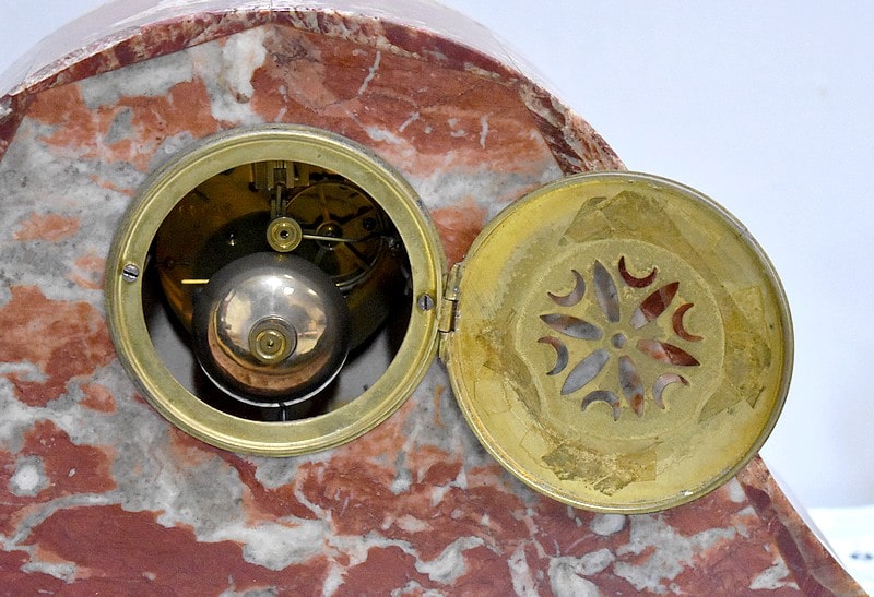 Cette dernière est ornée en façade de décorations florales en bronze de part et d’autres du cadran. Ce dernier en bronze est à chiffres arabes et Signé ‘Epernay’ en son centre. Le balancier également à décors de motifs floraux, est visible à travers une vitre en demi-lune bordée de bronze.
